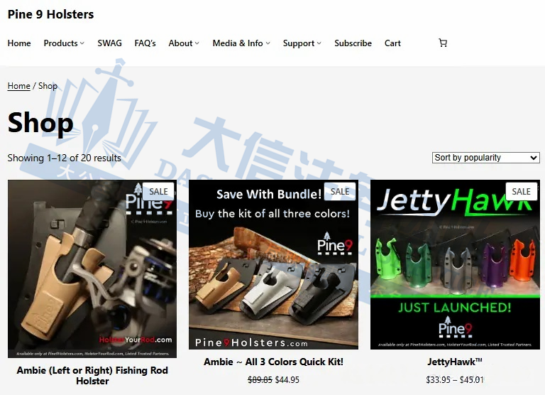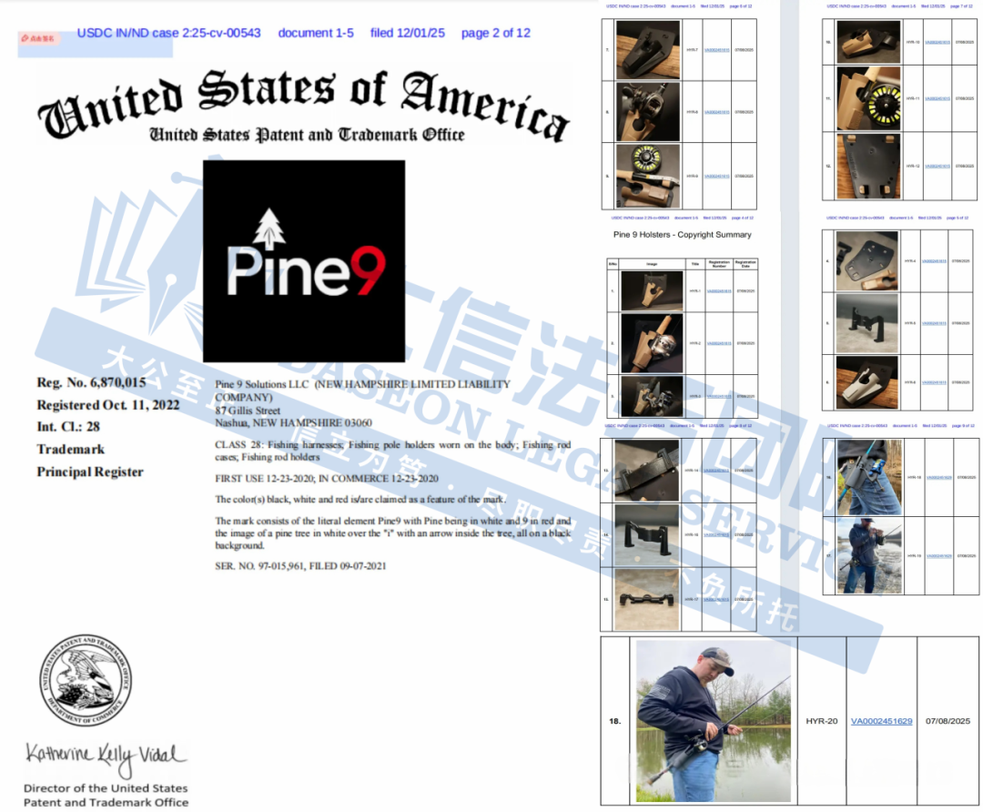 此案为版权+商标维权,涉及Pine 9图形商标,以及钓鱼竿套及其配件的产品图的维权,以下是涉及版权商标的具体信息,未经授权不可擅自使用,侵权风险极高,跨境卖家尽快检索下架,避免造成更大的侵权损失!