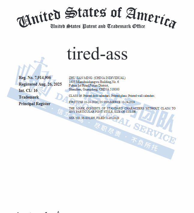 此案为商标维权,涉及商标词:Tired-ass,商标号为:7914906,注册种类在第16大类,涵盖:印刷版台历,印刷版图纸,印刷版挂历等类目,以下是涉及商标的具体信息,未经授权不可擅自使用,侵权风险极高,跨境卖家尽快检索下架,避免造成更大的侵权损失!