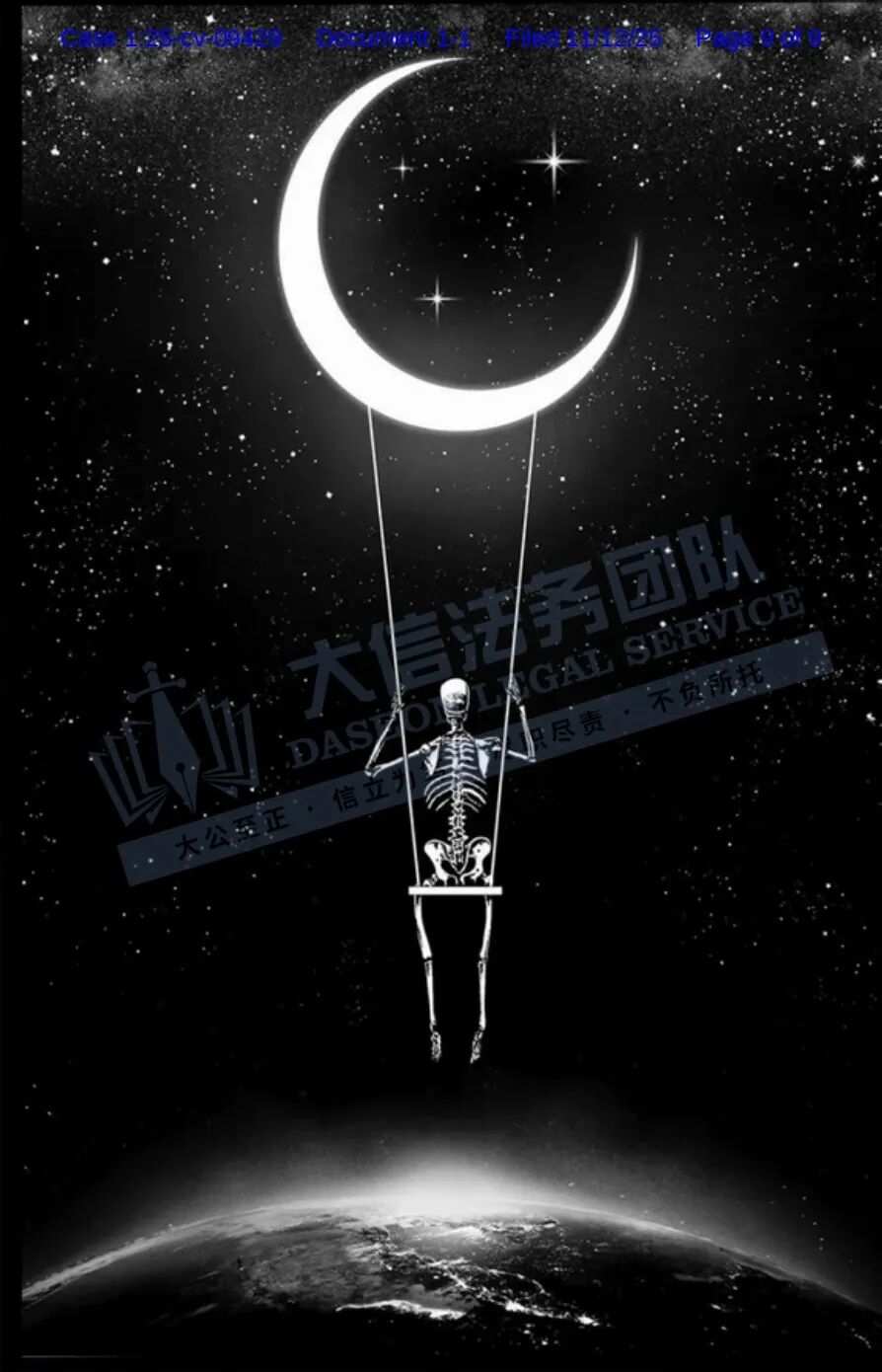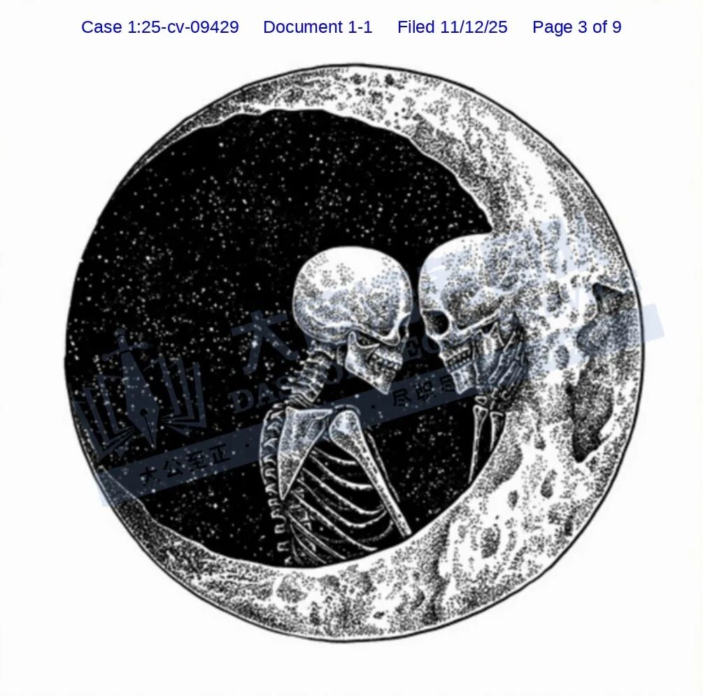原告Junaid Mortimer,常驻英国的当代艺术家,以深邃的黑白美学构筑独特视觉哲学。其作品核心贯穿“爱与死亡的浪漫”主题,在极简单色中探索情感与存在的两极——爱的炽热光亮与死亡的幽暗静默相互渗透,在画面中形成张力十足的叙事。艺术家巧妙融入哥特式元素:蜿蜒的荆棘、古典雕花、阴影中的建筑轮廓与象征性的骷髅意象,皆化为凝练的视觉诗行。