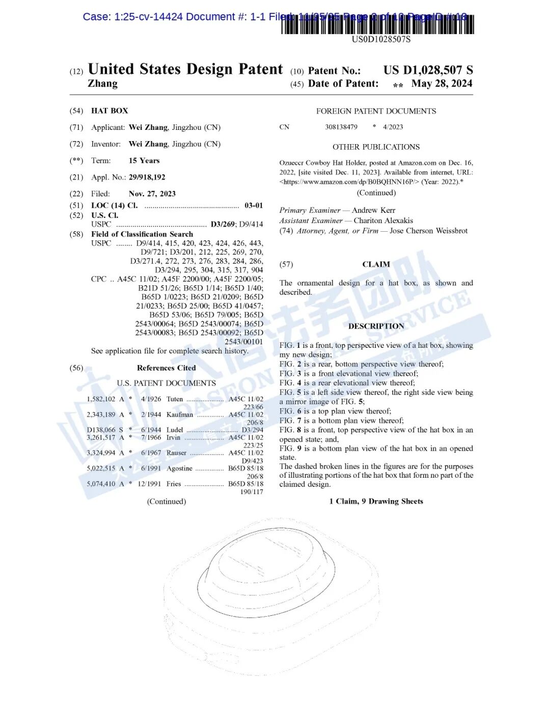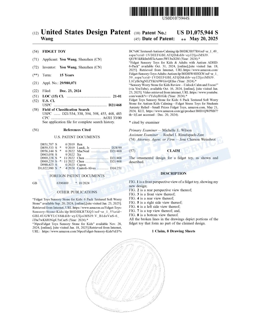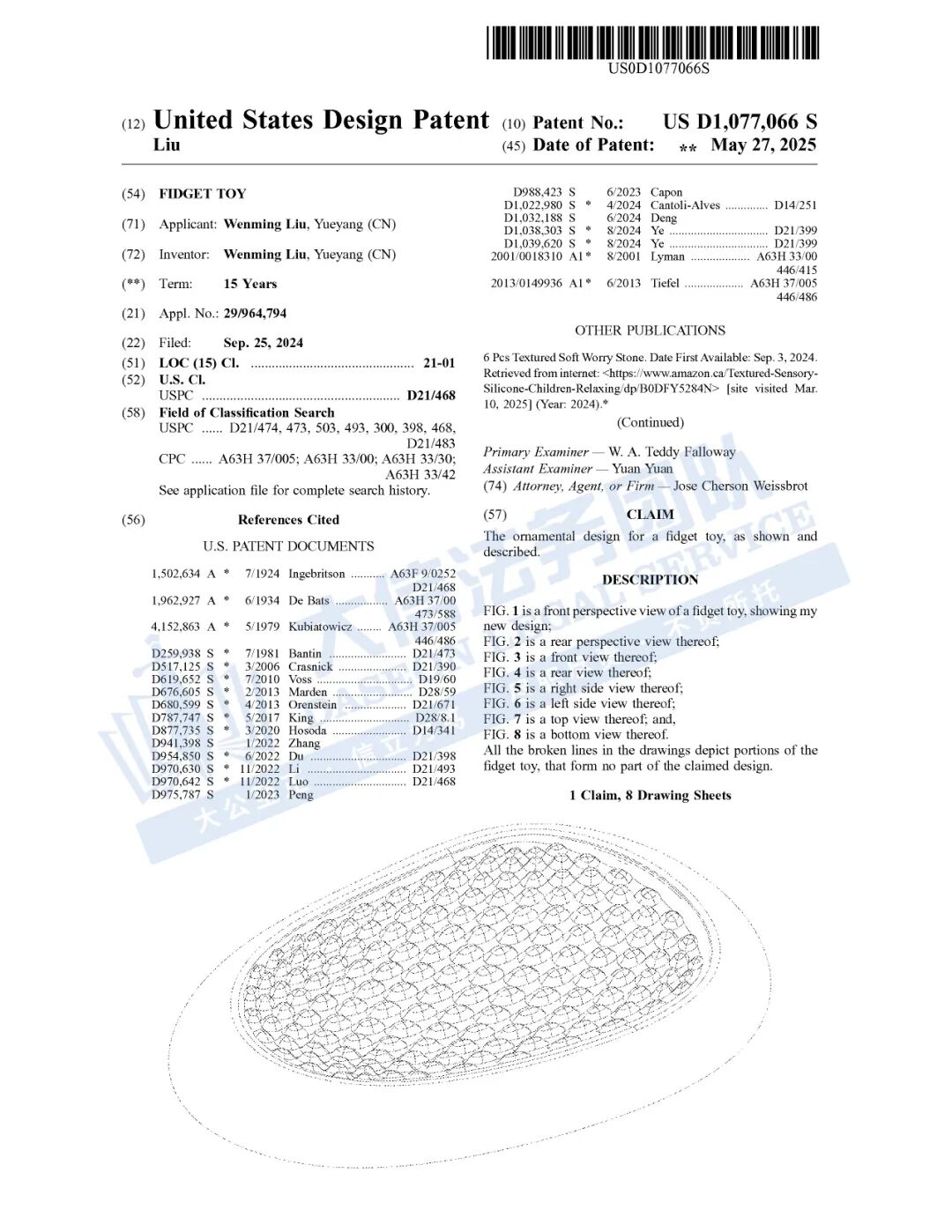 此案为专利维权,专利号D1075944和D1077066,分别于2025年5月20日和2025年5月27日获得美国外观专利认证。侵权风险极高!以下是维权具体信息,未经授权不得擅自使用,跨境卖家尽快检索下架,否则会有TRO侵权风险!