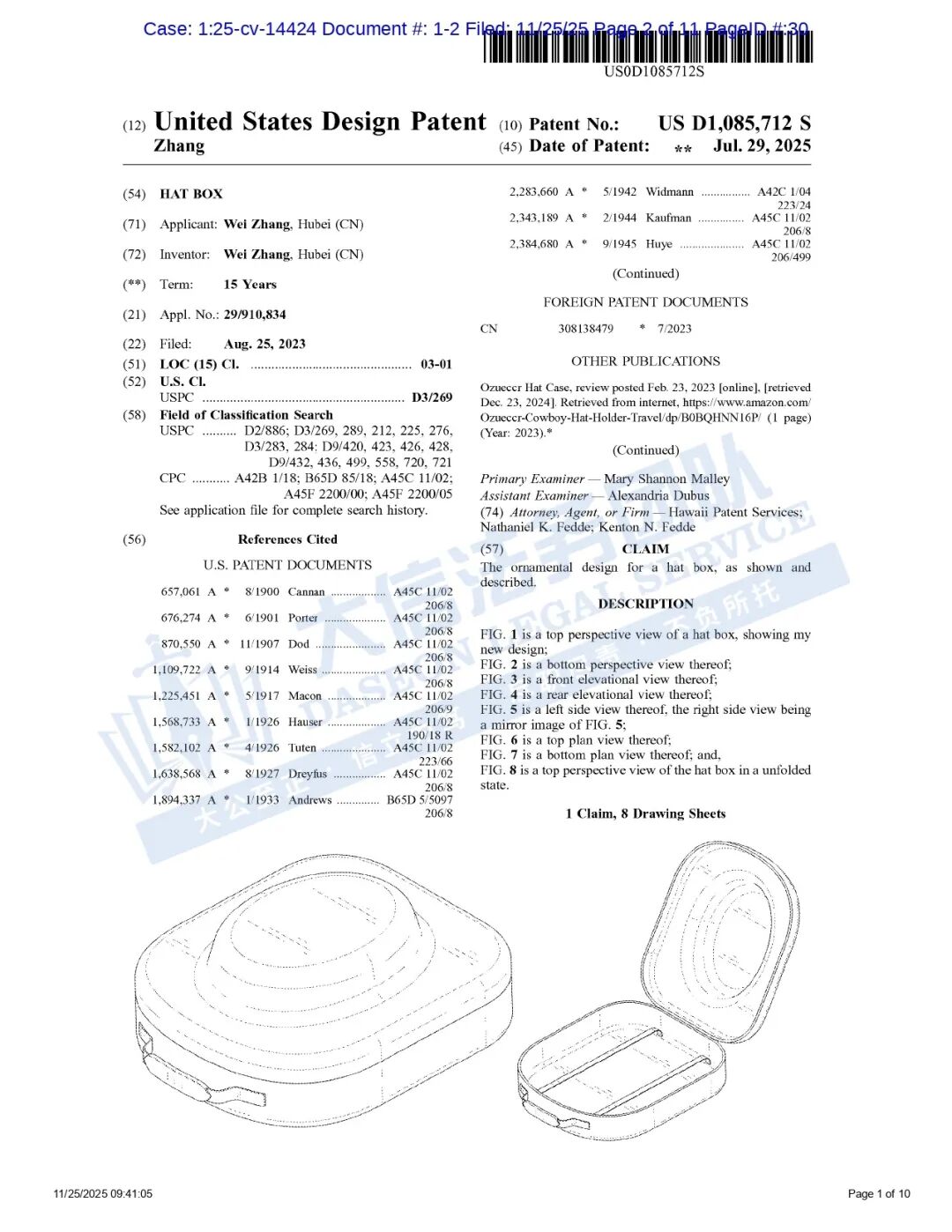 原告是深圳独立发明家,以其创新的旅行帽盒设计荣获两项美国外观设计专利。区别于大型企业,他通过亚马逊等电商平台直面消费者,将匠心融入产品。其设计的帽盒以流畅的椭圆形硬壳外观、优雅的皇冠形圆顶为特色,塑造出独特的商业外观。凭借广泛的销售与营销,这一设计已在市场建立起鲜明识别度,成为旅行配件中兼具美感与实用性的标志性作品。