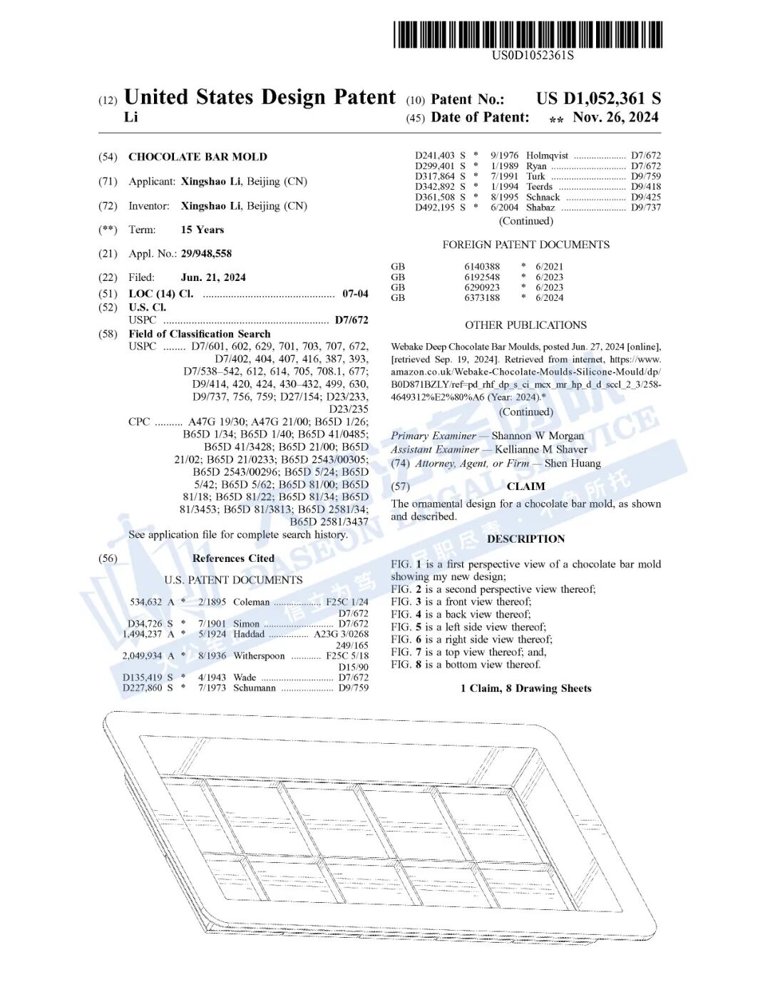 原告Xingshao Li,是位来自广州的独立产品设计师与创业者。自2015年起,他专注于巧克力棒模具的原创设计与商业化,推出多款兼具创意与实用性的产品。其核心理念在于简化巧克力制作流程,注入情感与乐趣,致力于为全球消费者提供高品质、充满爱意的巧克力制作解决方案。