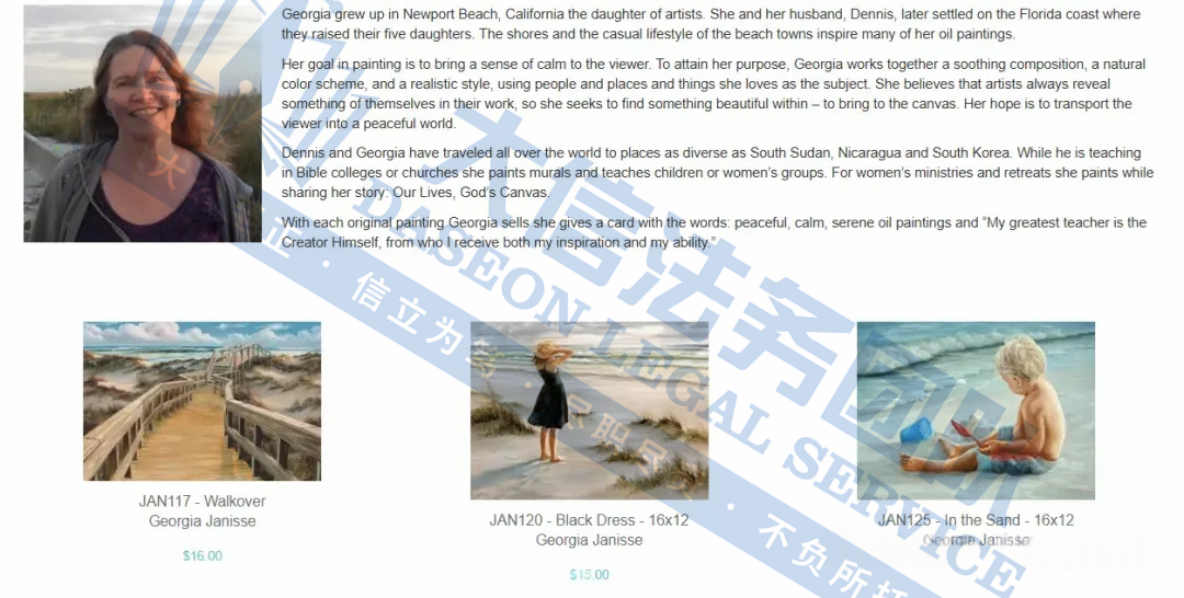 原告是来自美国的艺术家,其灵感来源于加利福尼亚州纽波特海滩,当地的海滩风光和悠闲的海滨小镇生活,擅长运用舒缓的构图、自然的色彩和写实的风格,以喜爱的人物、地点和事物为主题创作。通过柔和的构图、自然的色彩以及写实的画风,生动描绘自己眼中的风景。