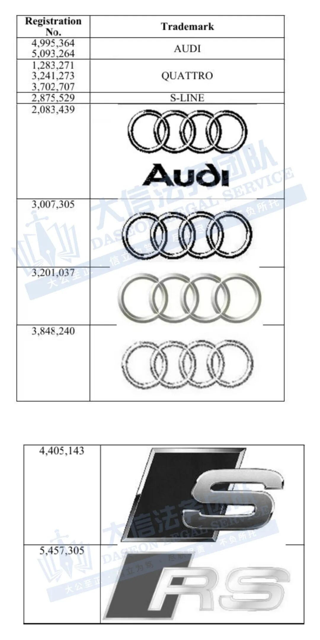 此案商标维权,关键词:AUDI、QUATTRO以及奥迪经典四圈图形商标,以下是维权具体信息,未经授权不得擅自使用,跨境卖家尽快检索下架,否则会有TRO侵权风险!