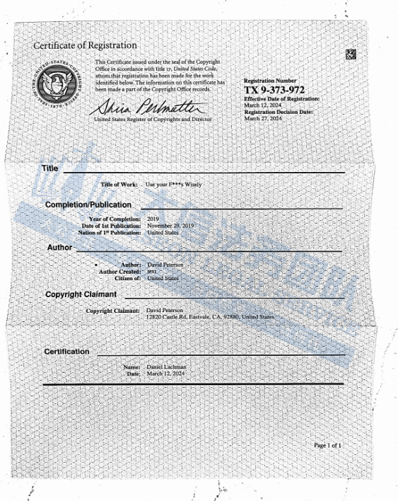 此案为版权维权,涉及一项带有《USE YOUR F***S WISELY》文字版权,版权号为:TX 9-373-972,目前具体版权图还未公开,以下图片可供卖家参考,除此之外,官网上的其他作品未经授权不得擅自使用,侵权风险极高,跨境卖家尽快检索下架,避免TRO侵权风险!