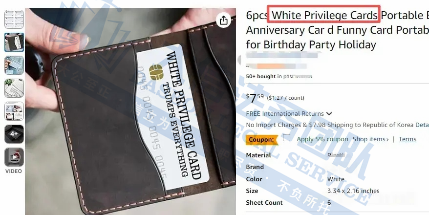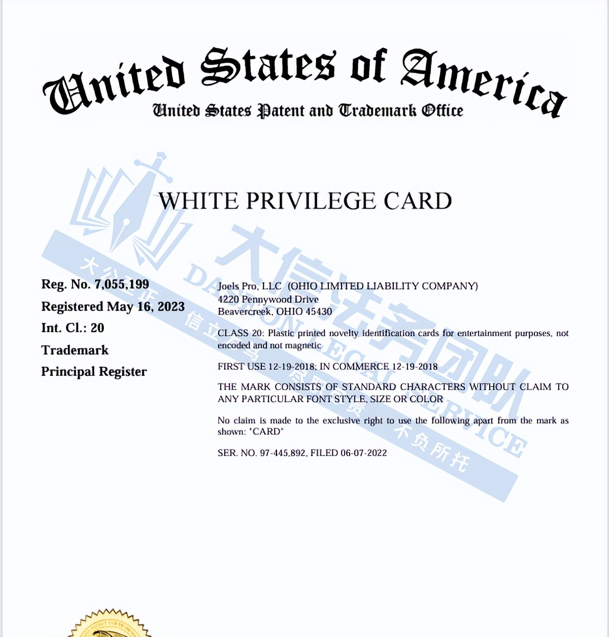 此案为商标维权,涉及关键词“White Privilege Card”,注册号为:7055199,于2023年5月16日下证,用于娱乐目的的塑料印刷 novelty 身份证,非编码且非磁性材质,以下是涉及商标的具体信息,侵权风险极高,跨境卖家尽快检索下架,避免TRO侵权风险!
