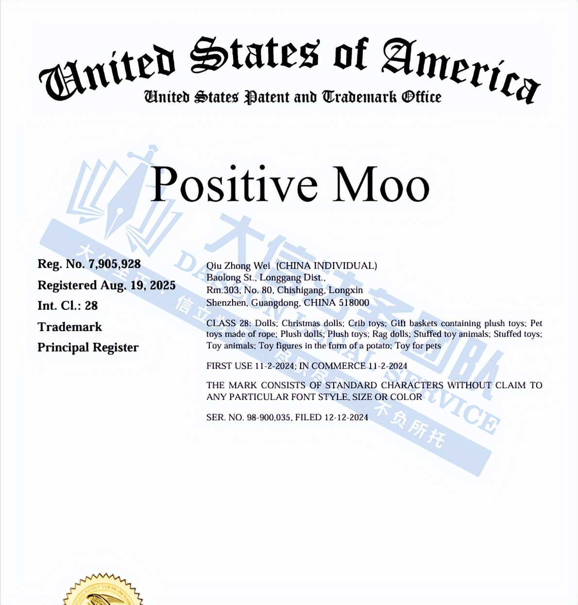 此案为商标维权,涉及涉及关键词“POSITIVE MOO”,注册号为:7905928,涵盖娃娃、毛绒娃娃、毛绒玩具、布娃娃、填充玩具动物、填充玩具、玩具动物、玩具人偶以及宠物玩具等类目,以下是涉及商标的具体信息,侵权风险极高,跨境卖家尽快检索下架,避免TRO侵权风险!