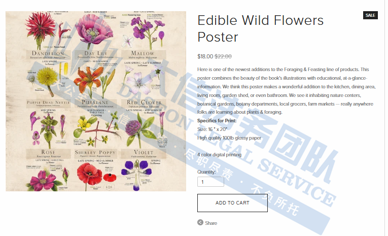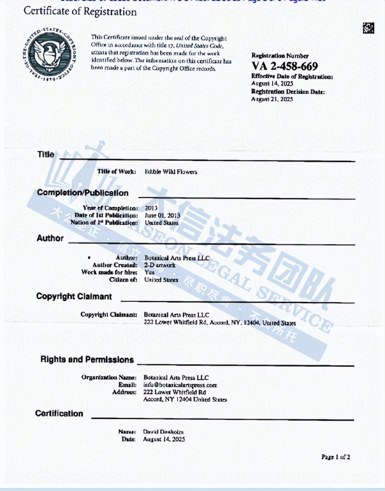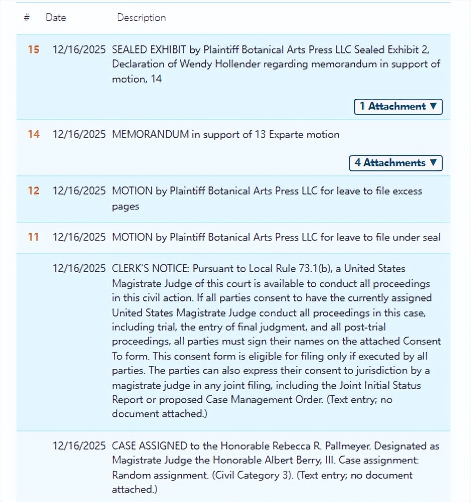 原告是植物艺术出版社有限责任公司,拥有一项版权登记,霍尔兰德和法尔科尼最初于 2009 年春季开始合作编写他们的著作,并在该书于 2013年7月出版前成功预售了近 3000册。自该书发行以染审植物艺术出版社已推出多种相关产品,包括头巾、便卡、海报和印刷品,展示书籍插图之美并附带教育信息。