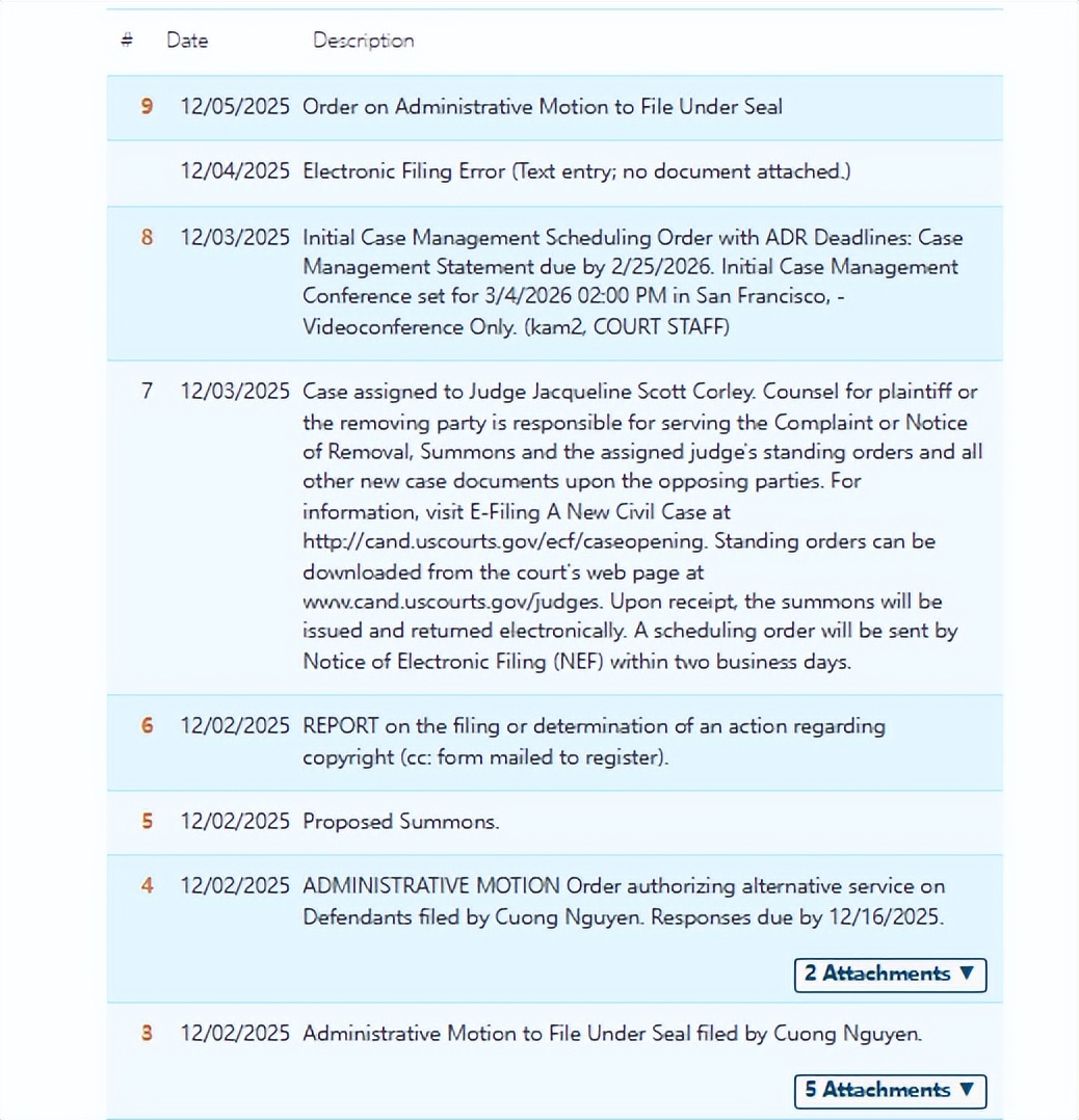受理法院:加利福尼亚北区联邦地区法院