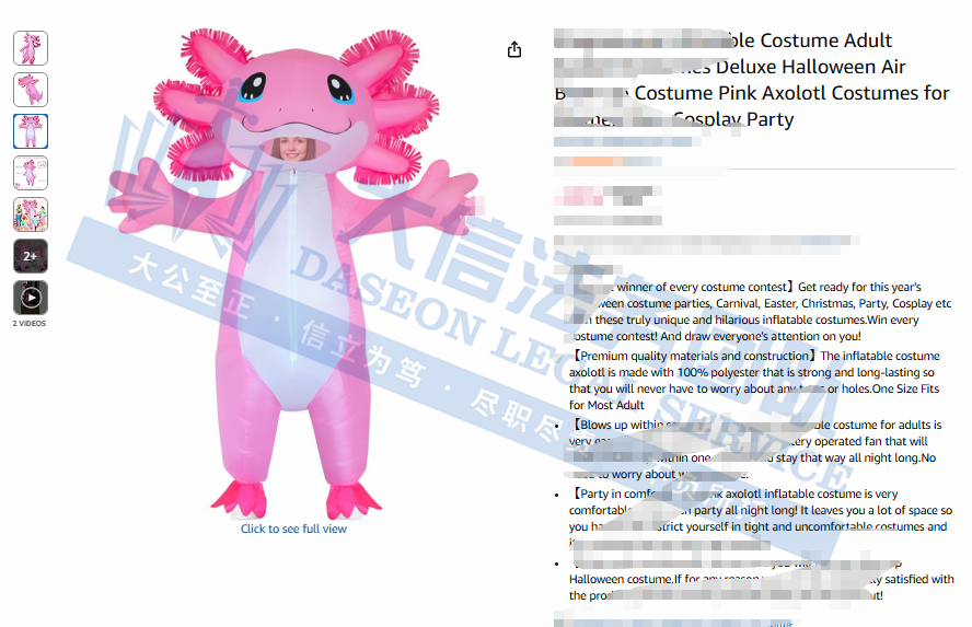 Guiping Zhang是Shenzhen Anru Electronics Co., Ltd的一位三维角色服装设计师,其作品剑龙、鲨鱼、奶牛、雪人以及墨西哥钝口螈等多个充气服装或装饰配件。以墨西哥钝口螈为灵感,模仿墨西哥钝口螈的外观,采用圆润的身体、短小的四肢以及独特的大眼睛和呆萌的面部特征设计的充气式服装,深受儿童喜爱。