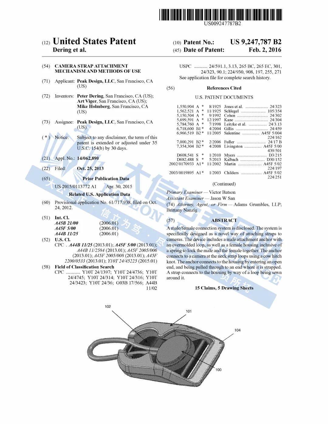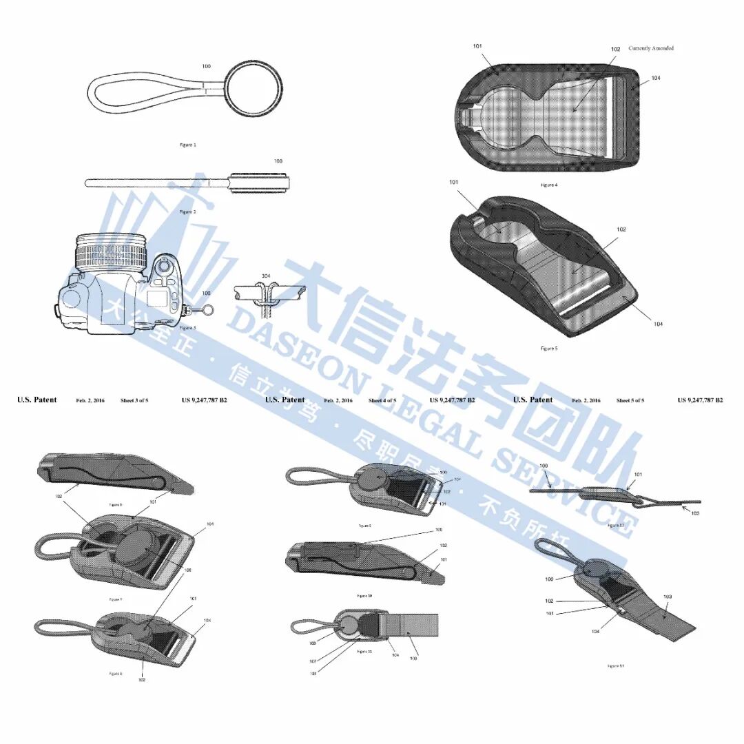 此案为专利维权,涉及一项相机背带连接机制及使用方法的发明专利,专利号:9247787,于2016年下证,注意,只要与该专利的设计理念相似,就会有侵权风险,以下是涉及专利的具体信息,未经授权不得擅自使用,侵权风险极高,跨境卖家尽快检索下架,避免TRO侵权风险!
