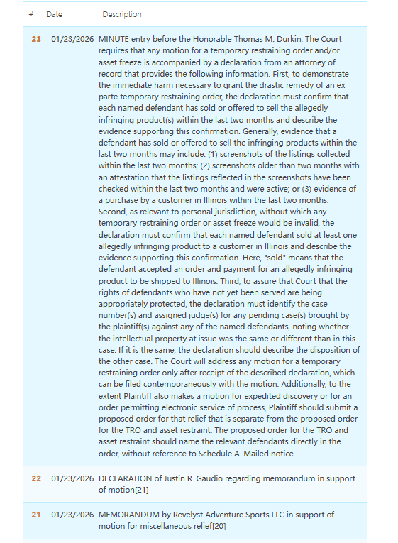 此案为版权维权,目前已有248家店铺被波及,涉及产品图片以及使用视频,版权号为:VA0002307073、VA0002447985、VA0002447986以及PAU0004138379,除此之外,官网上的图片均不可擅自使用,以下是涉及版权的具体信息,未经授权不得擅自使用,侵权风险极高,跨境卖家尽快检索下架,避免TRO侵权风险!