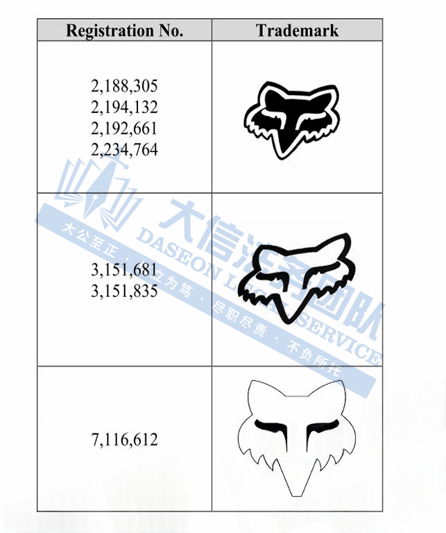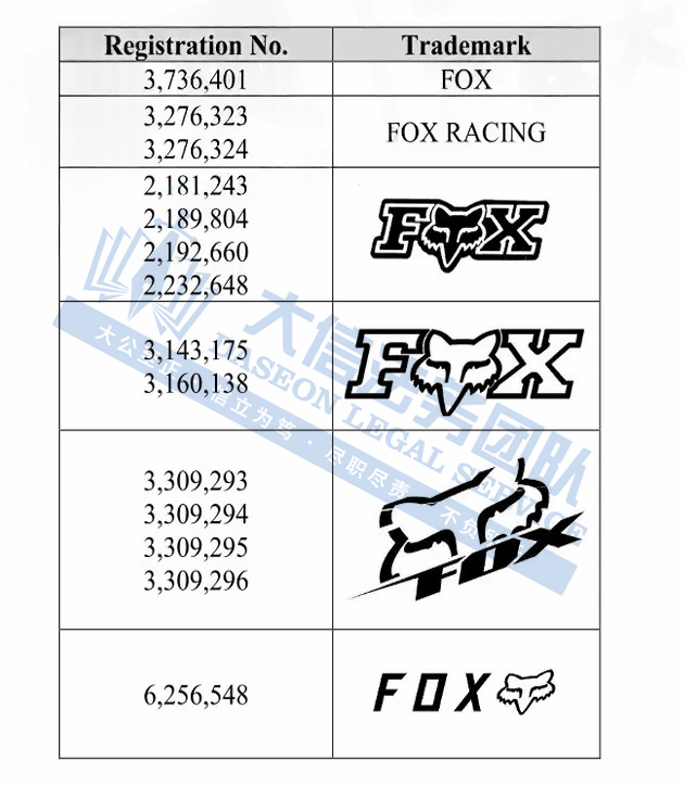 此案为商标维权,涉及FOX、FOX RACING等狐狸头Logo狐狸头的图文商标,除此之外,官网上的图片均不可擅自使用,以下是涉及商标的具体信息,未经授权不得擅自使用,侵权风险极高,跨境卖家尽快检索下架,避免TRO侵权风险!