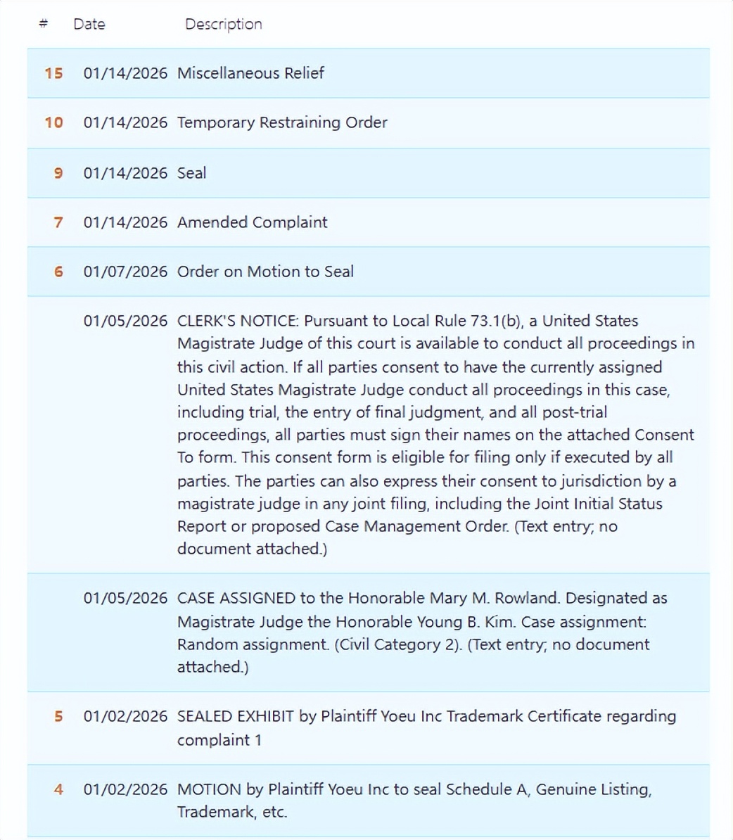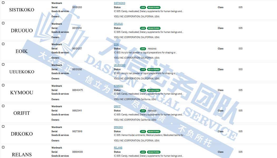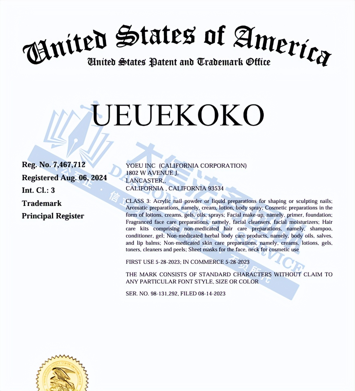 此案为商标维权,涉及UEUEKOKO商标维权,商标号:7467712,值得注意的是,原告在美国注册了7项商标,未经授权不得擅自使用,侵权风险极高,跨境卖家尽快检索下架,避免TRO侵权风险!