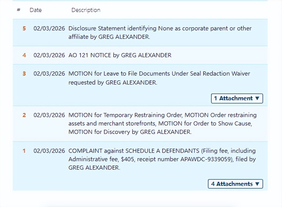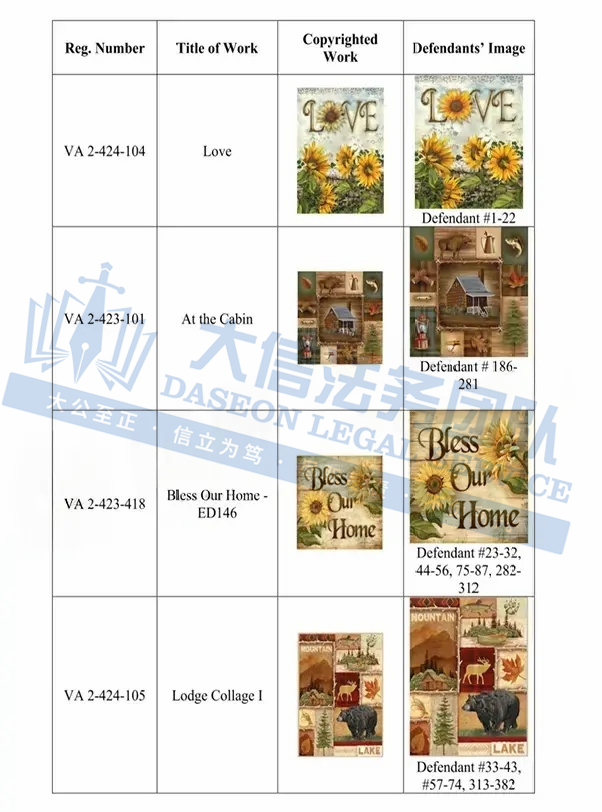 此案为版权维权,涉及4张版权图片,值得注意的是,原告在美国注册了10张版权,均于2024年11月7日下证,未经授权均不可擅自使用,侵权风险极高!以下是涉及版权的具体信息,跨境卖家尽快检索下架,否则会有TRO侵权风险!