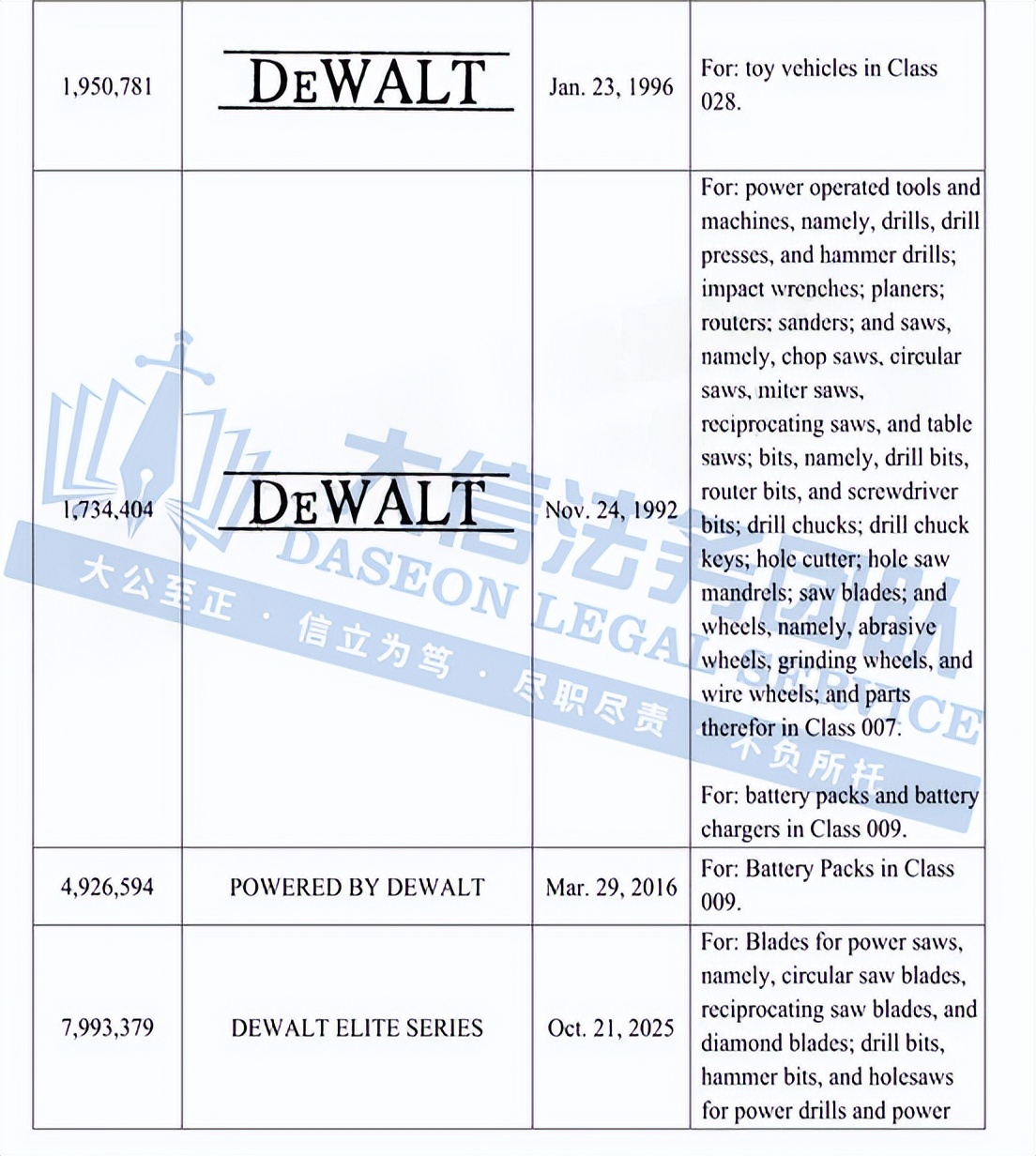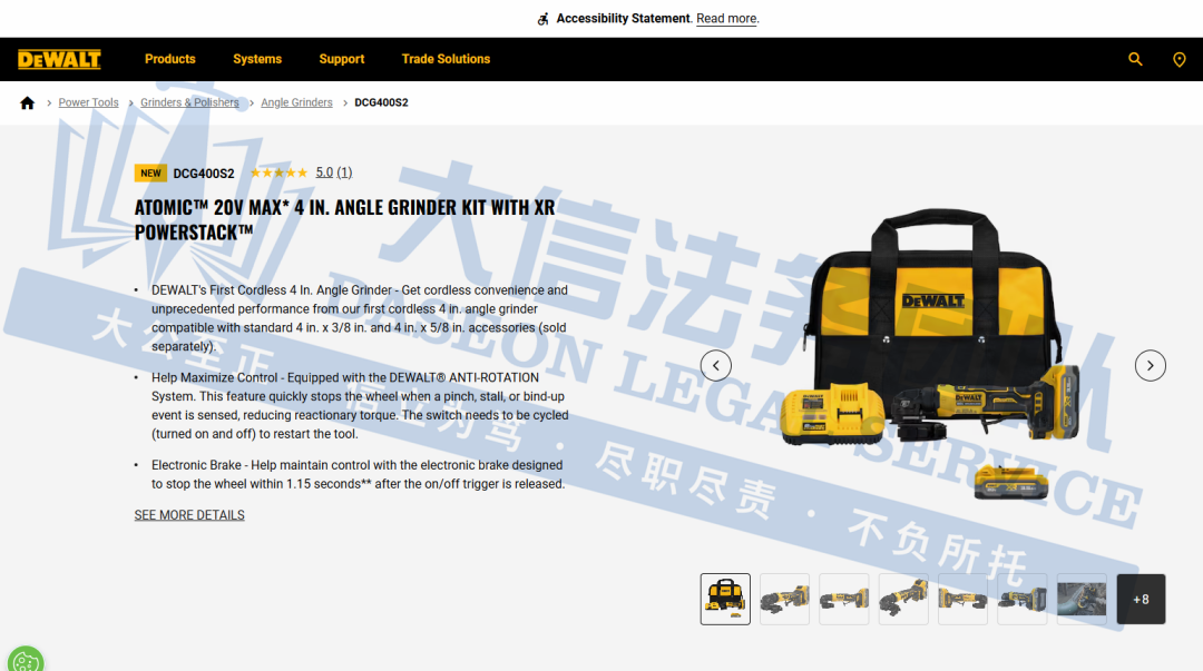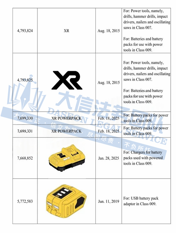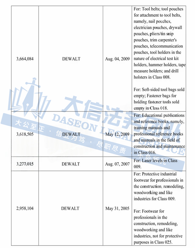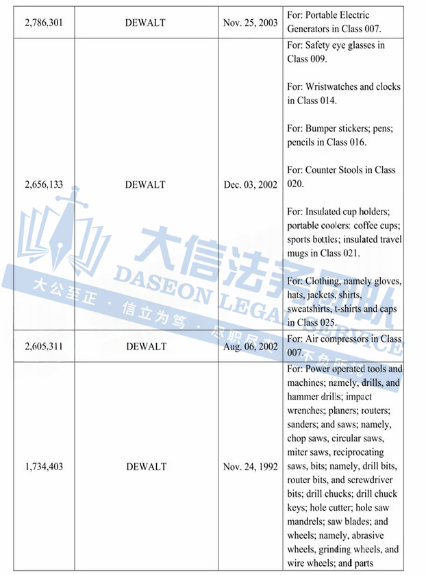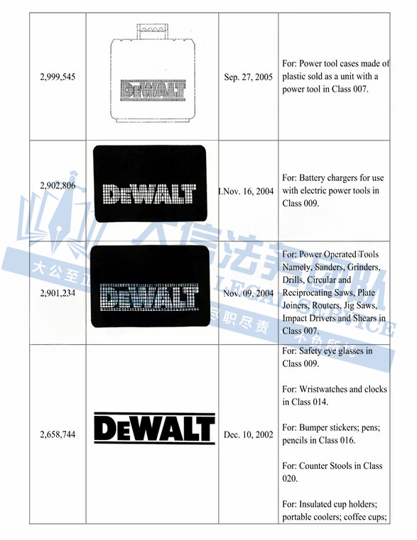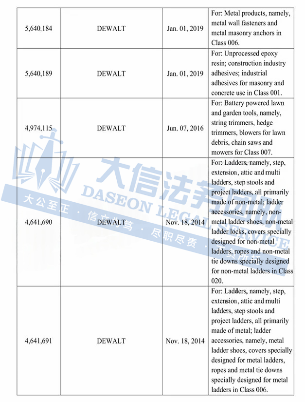 此案为商标维权,涉及超多商标,以”DEWALT“商标词为主,注意,此次是原告首次维权,原告连发两案,来势汹汹,卖家在上架产品时,一定要注意筛查,以下是涉及商标的具体信息,除此之外,官网上的其他作品未经授权不得擅自使用,侵权风险极高,跨境卖家尽快检索下架,避免TRO侵权风险!