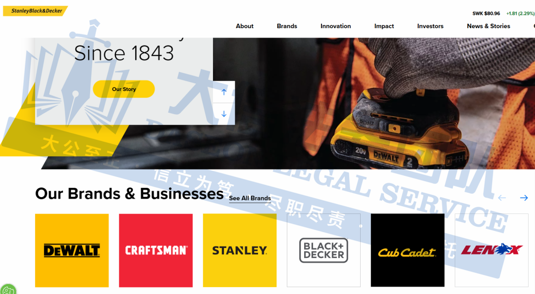 原告是全球领先的工具和户外产品制造商,史丹利(Stanley)成立于1843年,百得(Black & Decker)成立于1910年,2010年两家公司合并组建Stanley Black & Decker, Inc.,涵盖手动工具(如卷尺、扳手、螺丝刀)、电动工具(如电钻、角磨机、电锤)、气动工具、紧固件、工具箱、存储设备、户外设备(如割草机、园林工具)等,凭借百年历史积淀、多元化品牌战略和持续创新,成为全球工具行业的领军企业。
