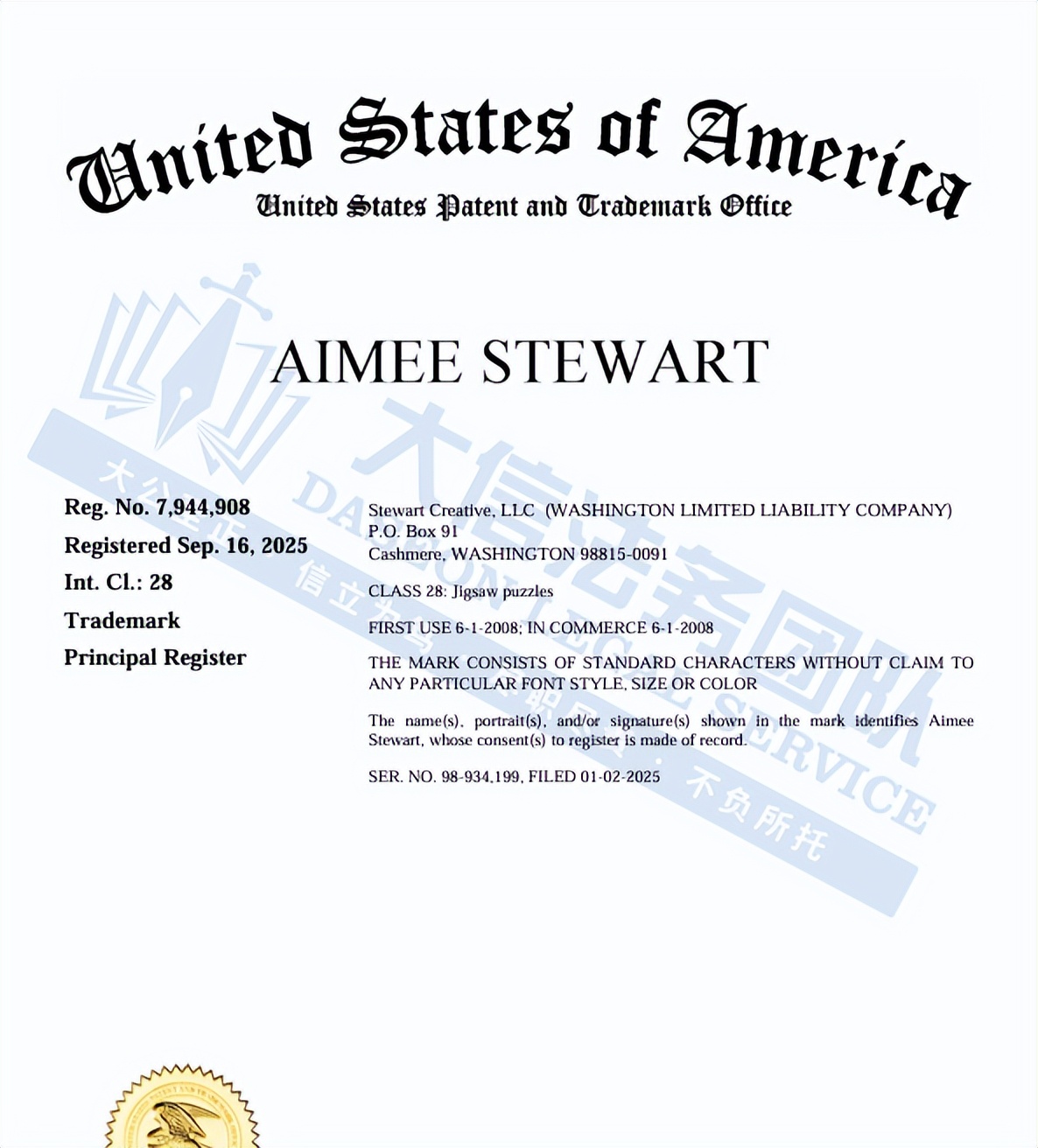 此案为商标维权,目前已有44家店铺被波及,涉及1个商标,商标词:Aimee Stewart,商标号:7944908,于2025年9月16日下证,除此之外,官网的其他作品未经授权均不得擅自使用,以下是涉及商标具体信息,未经授权不得擅自使用,侵权风险极高,跨境卖家尽快检索下架,避免造成更大的TRO侵权损失!