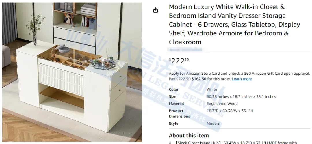 原告是来自中国香港的跨境卖家,专注于大件家居产品的跨境贸易,包括但不限于家具、卫浴设备等;致力于为用户提供杂志品质、设计前卫且价格亲民的家居产品,轻松拥有奢华生活。旗下有一款明星产品,采用六个宽敞的抽屉和便捷的开放式置物架,完美融合了美观与实用性,使不同类目的产品可以分门别类收纳,告别杂乱无章。