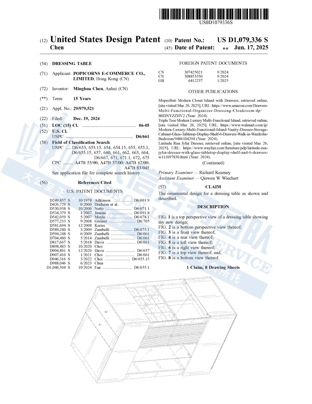 此案为专利维权案件,目前有44家店铺被冻,专利号为D1079336的梳妆台,于2024年12月19日申请,并于2025年6月17日下证,注意,该维权为外观专利,只要外观相似就会有侵权的风险,以下是涉及专利的具体信息,未经授权不得擅自使用,侵权风险极高,跨境卖家尽快检索下架,避免TRO侵权风险!
