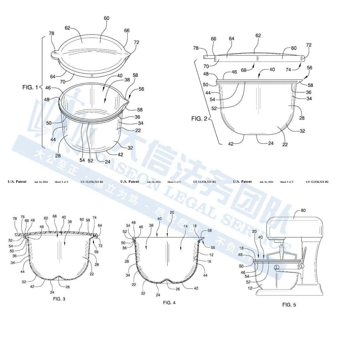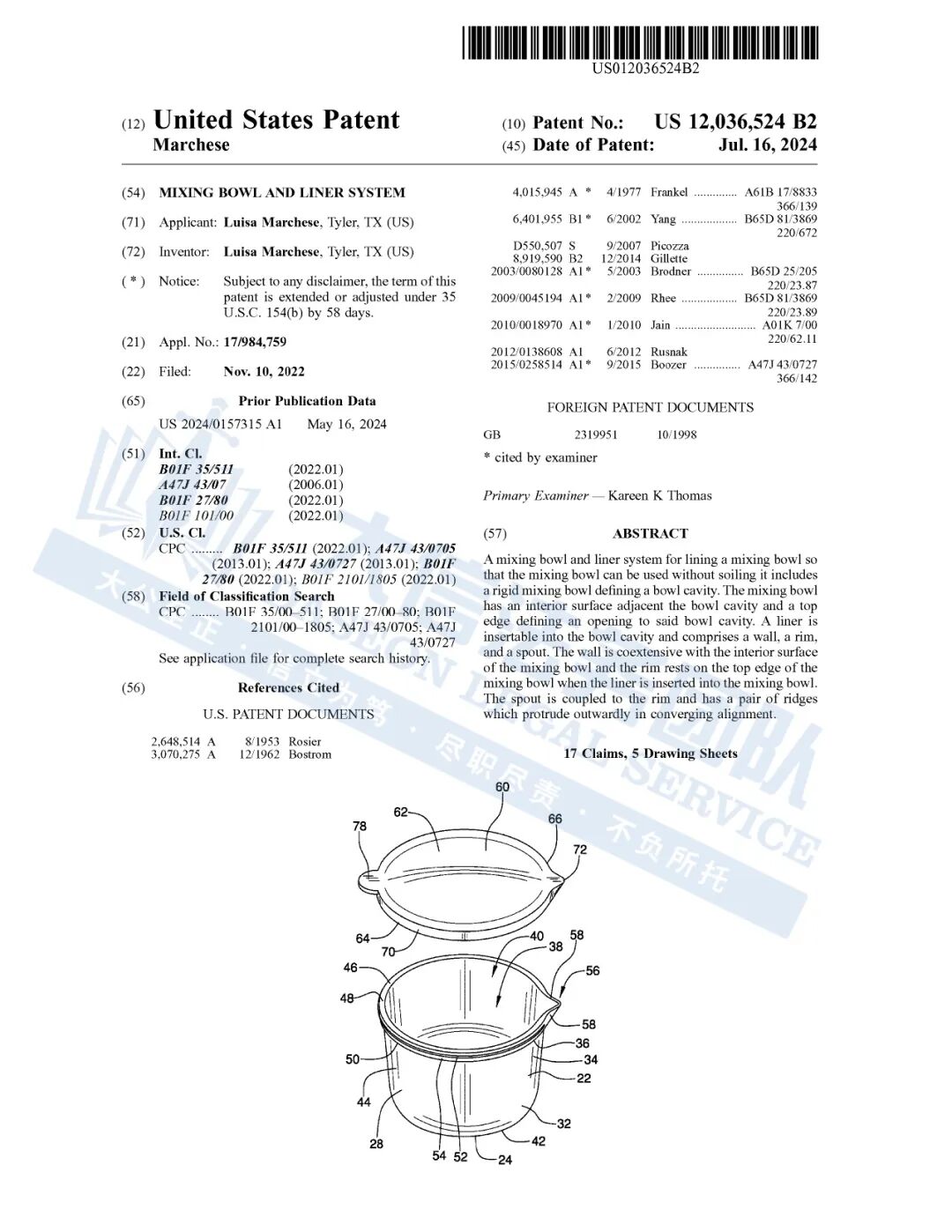 此案为专利维权,涉及一项发明专利,专利号:12036524,于2024年7月16日下证,注意,该专利为发明专利,保护刚性搅拌碗、可插入式衬垫、弹性柔性盖子三大核心部件,只要涉及理念相似就会有侵权风险,以下是涉及专利的具体信息,跨境卖家尽快检索下架,避免TRO侵权风险!