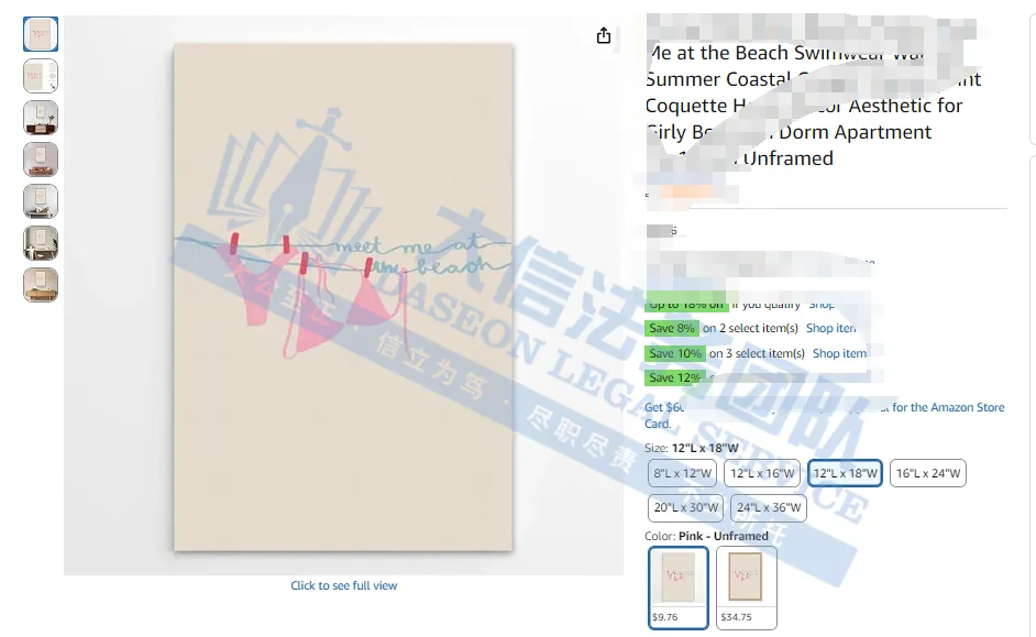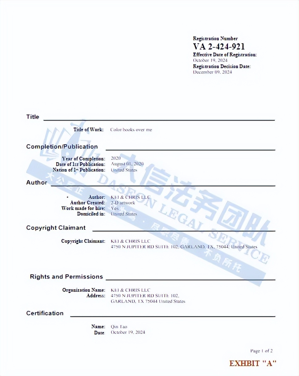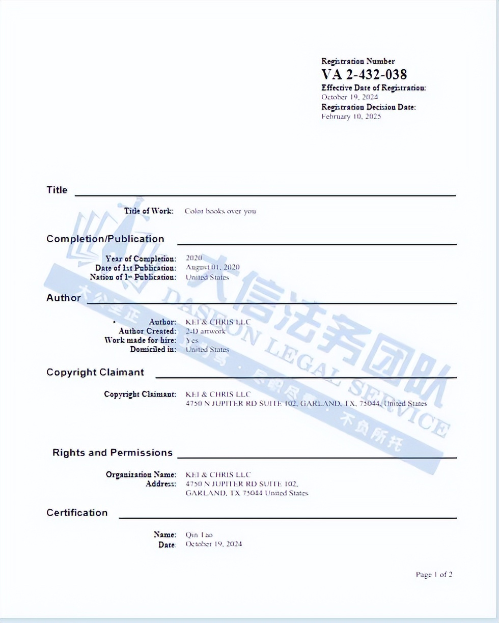 此案为版权维权,涉及1张版权图,版权号:VA 2-453-006,于2025年4月9日下证,除此之外,官网上的图片均不可擅自使用,以下是涉及版权的具体信息,未经授权不得擅自使用,侵权风险极高,跨境卖家尽快检索下架,避免TRO侵权风险!