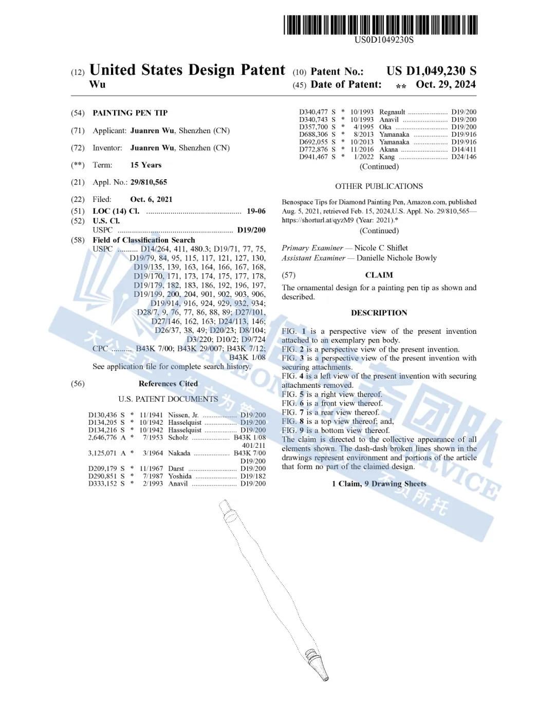 此案为专利维权,涉及一项钻石画笔尖替换件的外观专利,专利号:D1049230,于2021年10月6日申请,2024年10月29日下证,以下是涉及专利的具体信息,除此之外,官网上的其他作品未经授权不得擅自使用,侵权风险极高,跨境卖家尽快检索下架,避免TRO侵权风险!