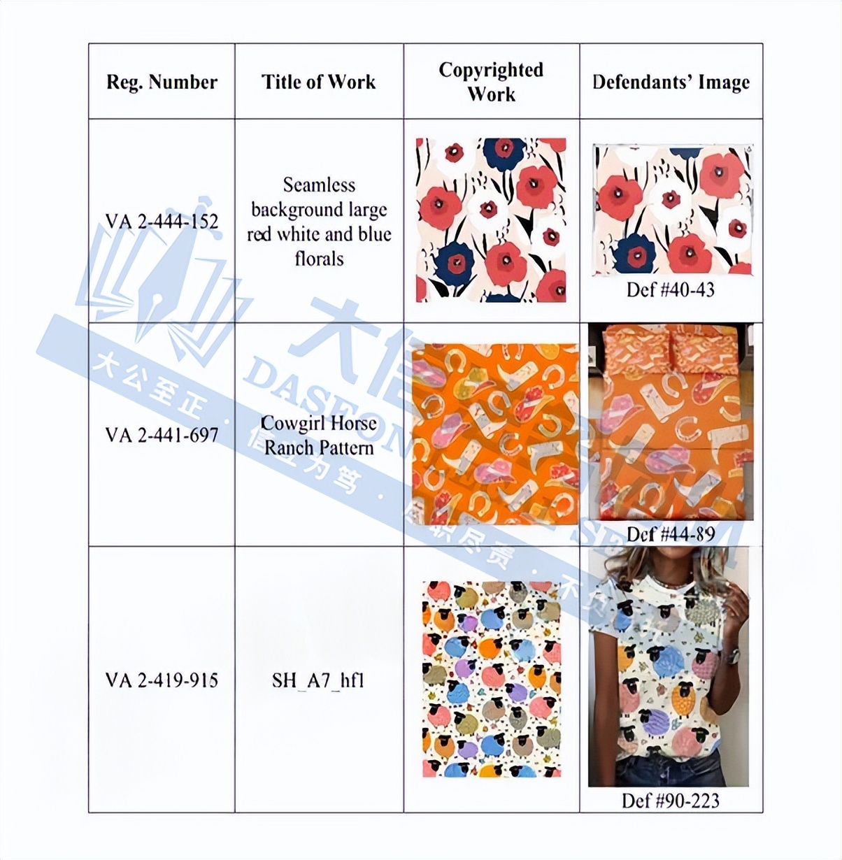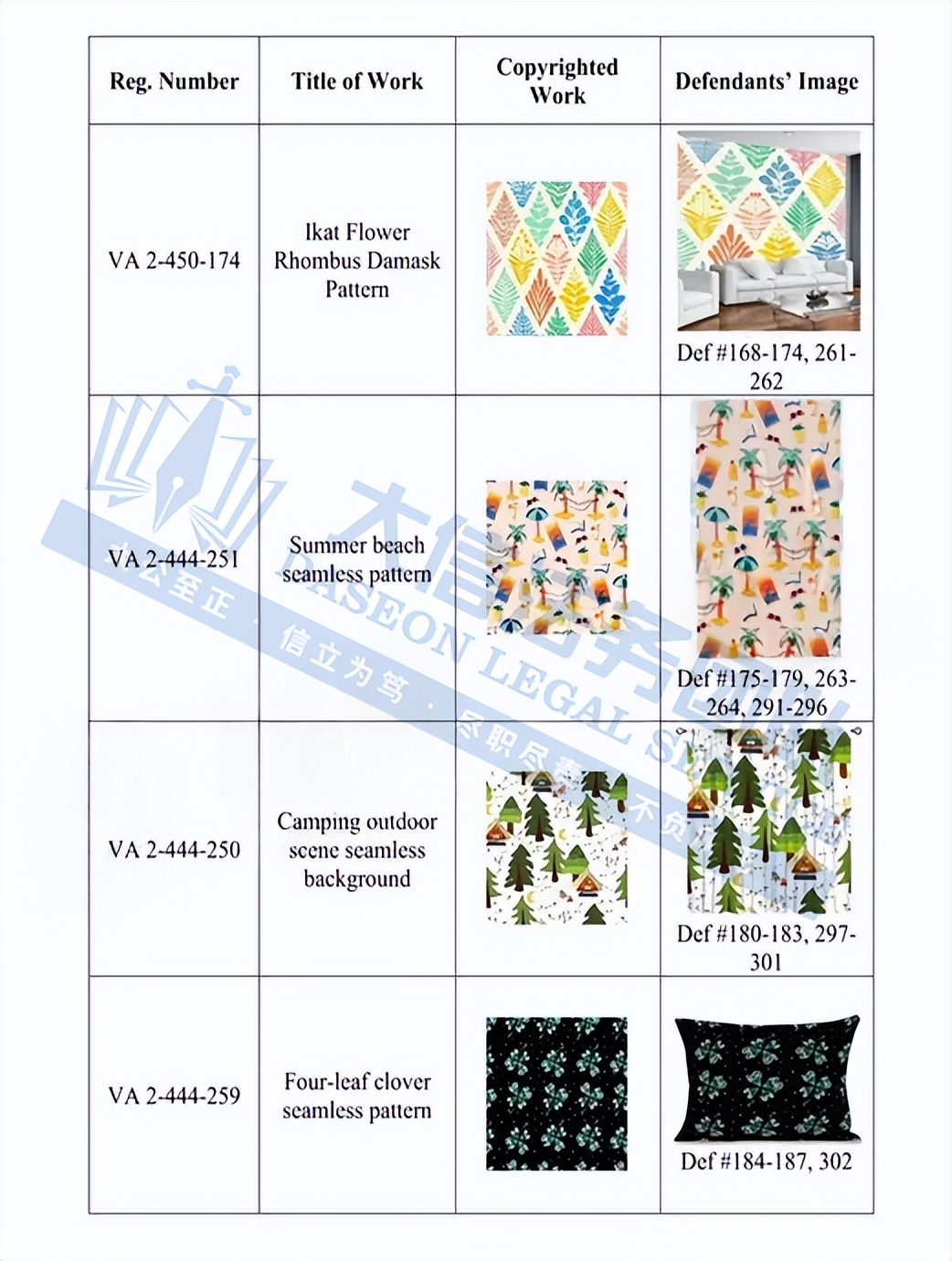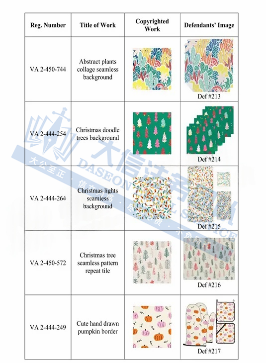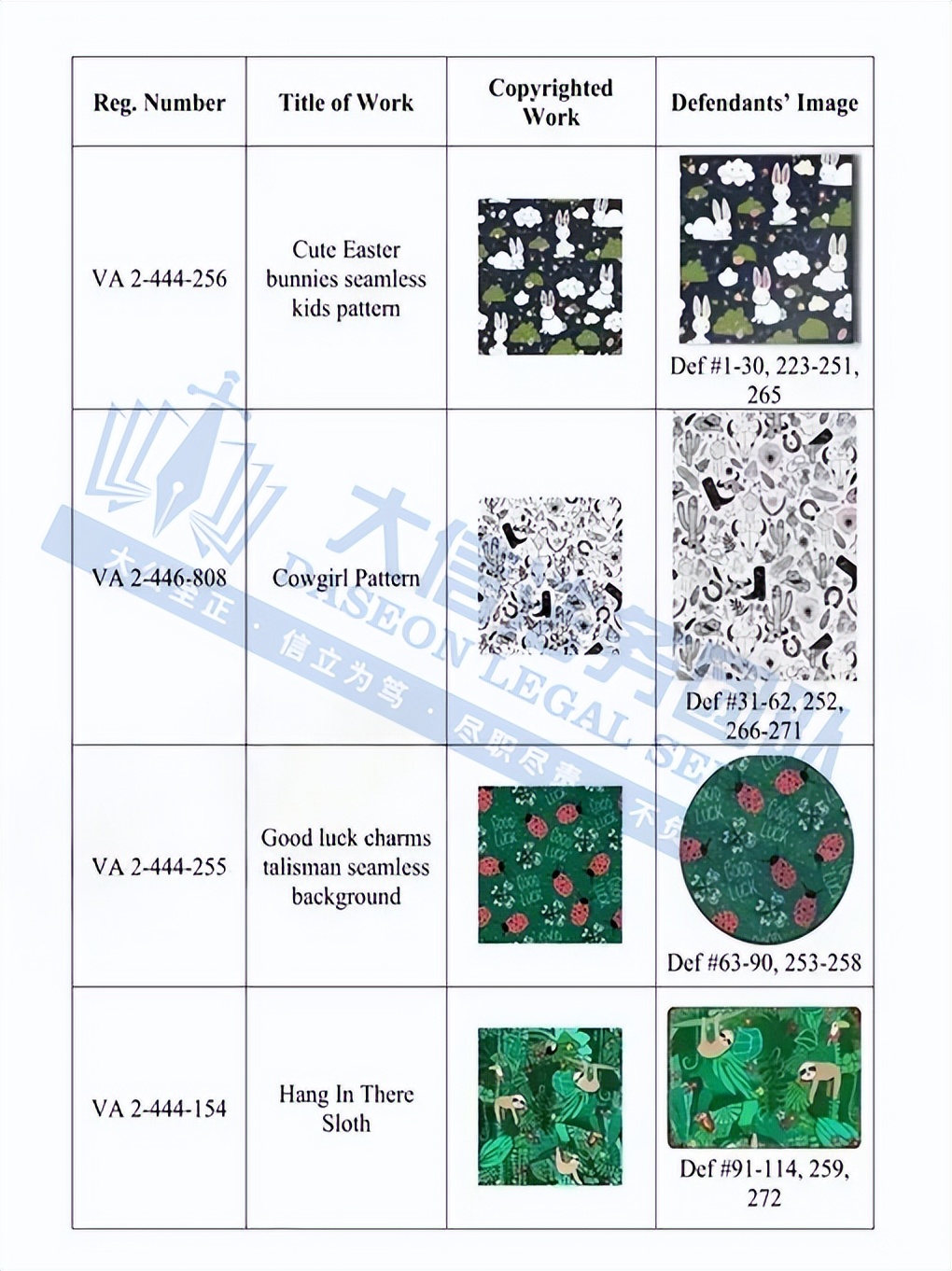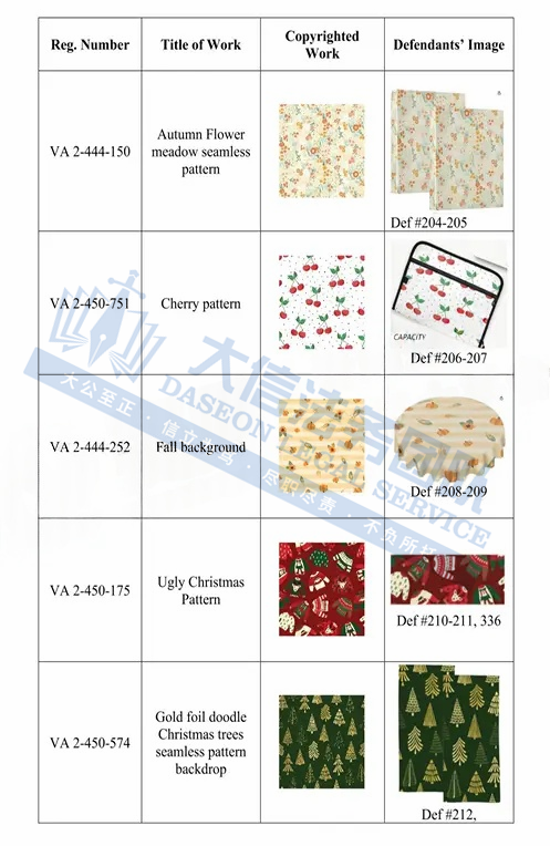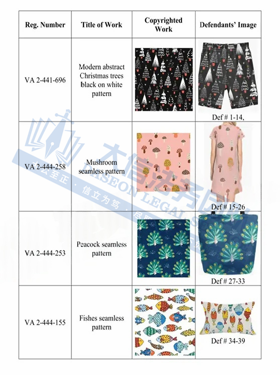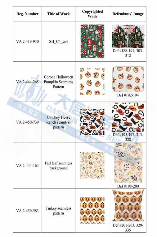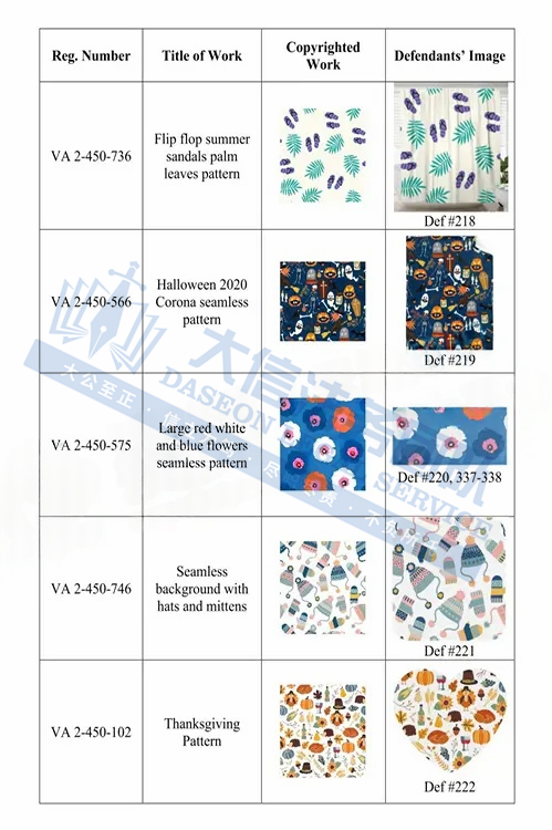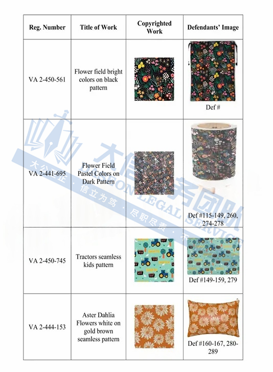 此案为版权维权,目前已有22家店铺被波及,涉及8张版权图,版权号: VA 2-272-455;VA 2-272-020; VA 2-272-309; VA 2-271-657; VA 2-269-424; VA 2-274-287; VA 2-274-018;and VA 2-272-013 ,跨境卖家一定要注意检索下架,未经授权不得擅自使用,以下是涉案版权信息,可供卖家参考,避免TRO侵权损失!