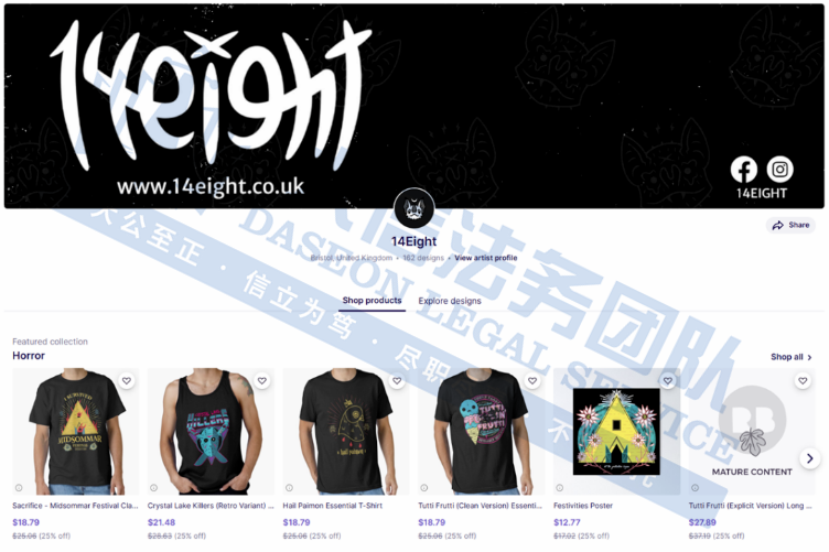 原告是一位来自英国布里斯托尔的全职艺术家和插画师。他拥有超过15年的专业创作经验,并于2019年决定追逐梦想,成为全职艺术家。他还创立了自己的 14Eight工作室,的艺术风格独树一帜,被描述为 “大胆、活泼、极简、现代和哥特式” 。他的灵感来源非常多元,融合了流行文化、神秘学、恐怖电影以及电子游戏等元素,创造出一种既带有暗黑华丽感,又兼具现代时尚气息的视觉效果。