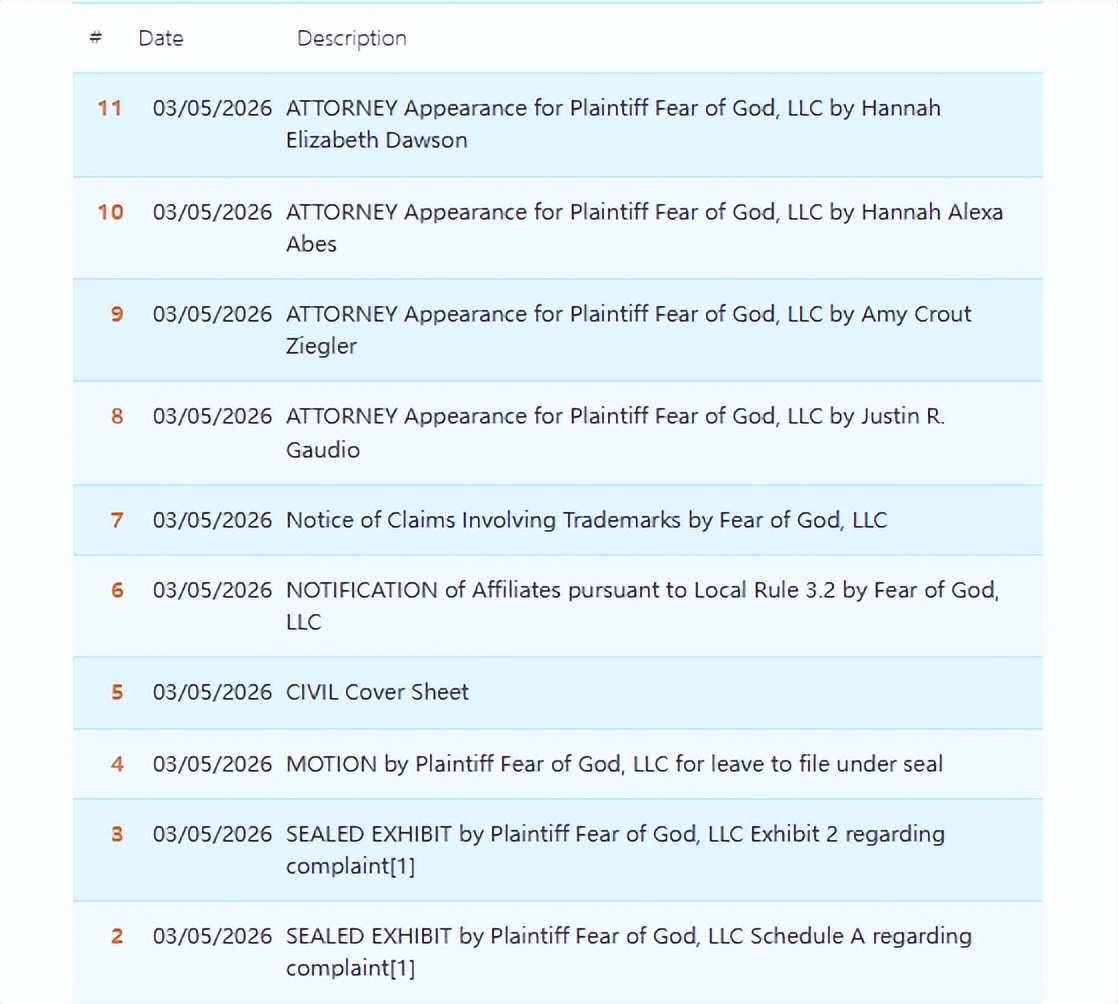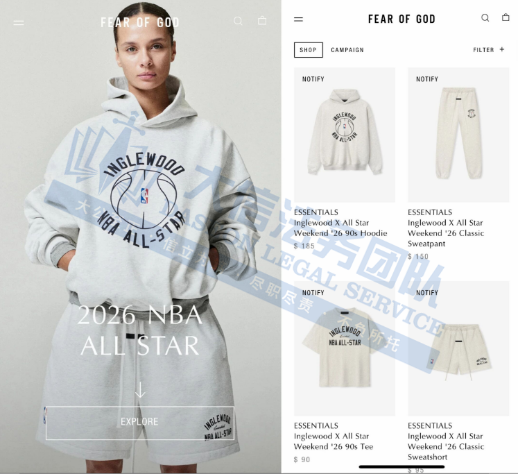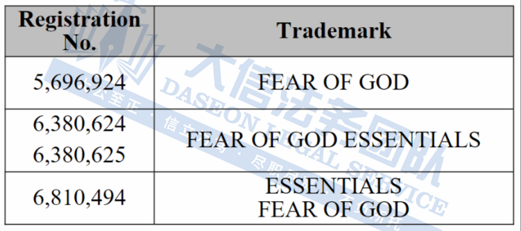 此案为商标维权案件,关键词:FEAR OF GOD、FEAR OF GOD ESSENTIALS、ESSENTIALS、FEAR OF GOD;卖家在选品时一定要注意检索!以下是涉及商标的具体信息,未经授权不得擅自使用,侵权风险极高,跨境卖家尽快检索下架,避免TRO侵权风险!