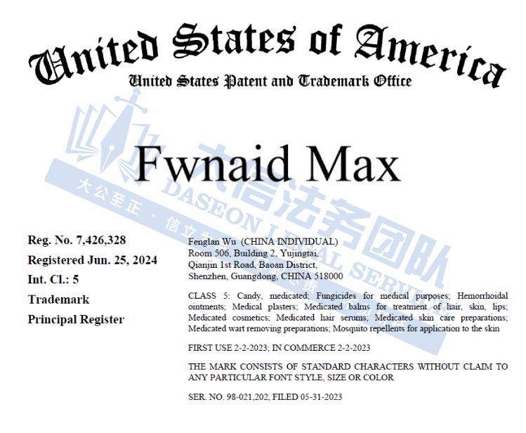 此案为商标维权,涉及一项商标,商标词:Fwnaid Max,商标号:7426328,于2024年6月25日下证,涵盖药物糖果、医用杀菌剂、痔疮软膏、医用膏药;用于治疗头发、皮肤、嘴唇的药物香膏等类目,以下是涉及商标的具体信息,未经授权不得擅自使用,侵权风险极高,跨境卖家尽快检索下架,避免TRO侵权风险!
