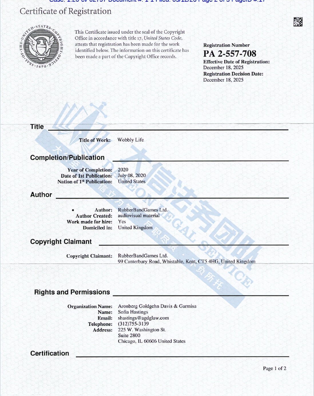 此案版权维权,涉及1张版权图,名称“Wobbly Life”,版权号:PA 2-557-708,目前仅公开涉案版权证书,未公开具体版权图,以下图片仅供参考,除此之外,官网上图片均不可擅自使用,以下是涉及版权的具体信息,未经授权不得擅自使用,侵权风险极高,跨境卖家尽快检索下架,避免TRO侵权风险!