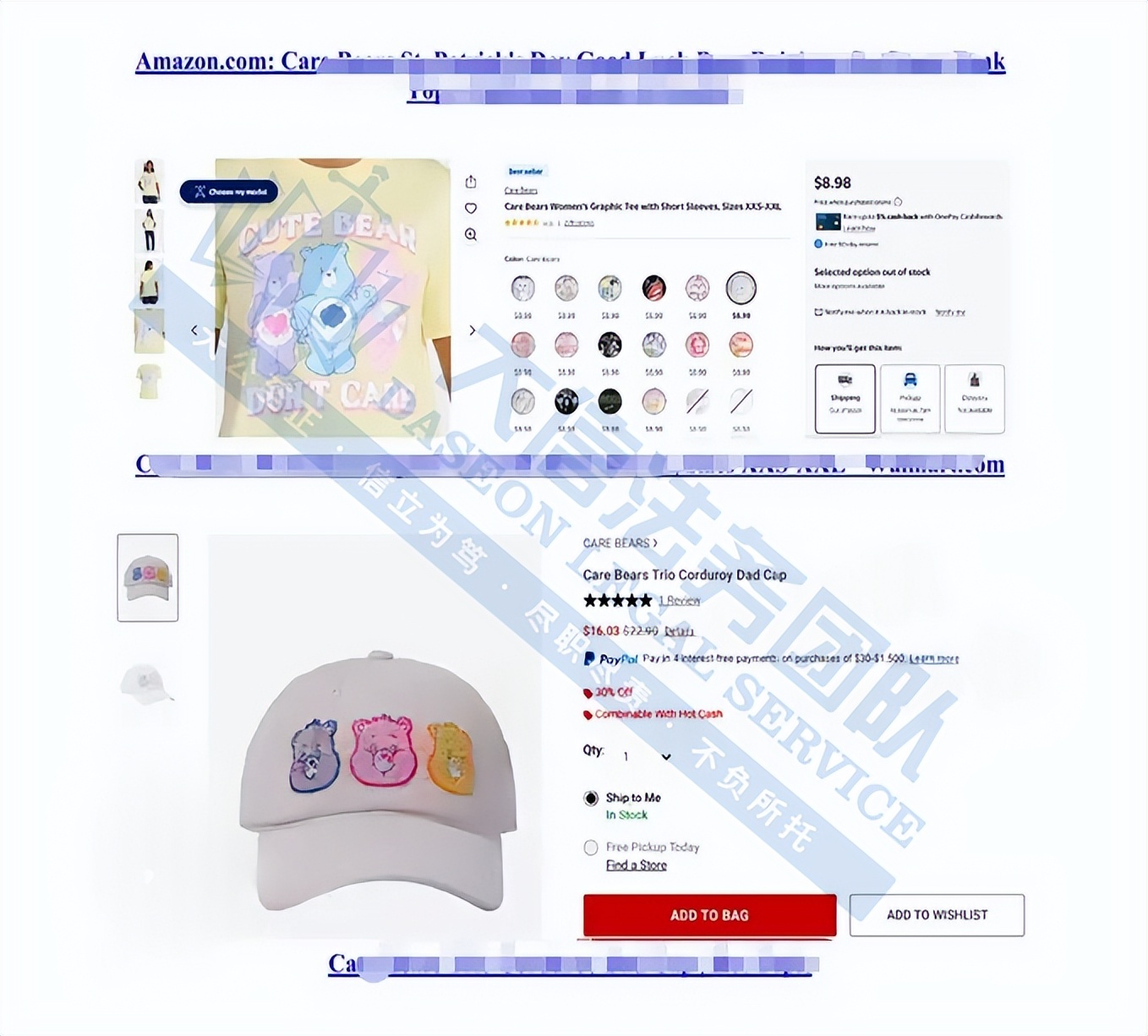 此案涉及商标版权信息如下,Care Bears商标及其在2010年和2015年分别注册了美国版权注册证:VA 1-824-810和VA 1-982-408共涉及百余张版权图片维权,近几年原告频繁维权,尤其在亚马逊等电商平台上,Care Bears相关产品的销量一直居高不下,搜索“Care Bears”即可发现超过10000个在售listing,侵权风险极高!相关卖家尽快检索下架!