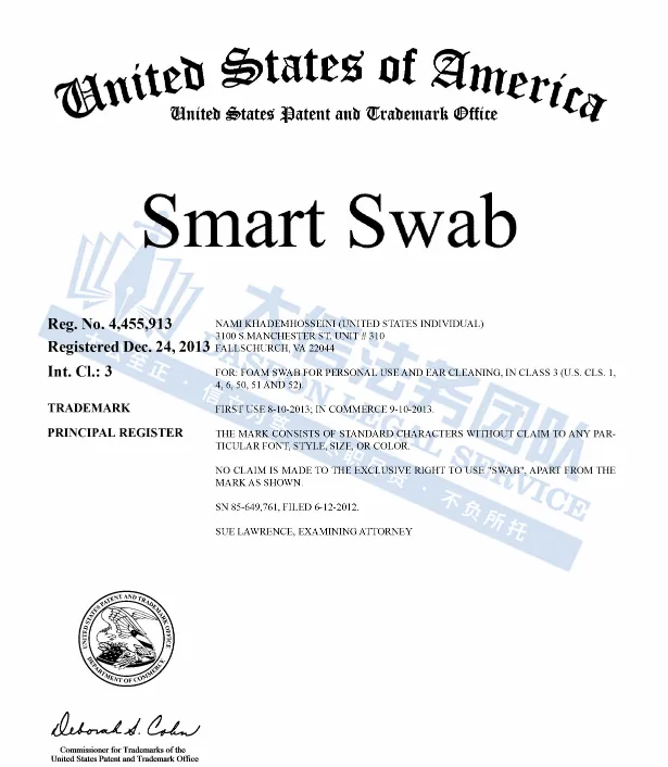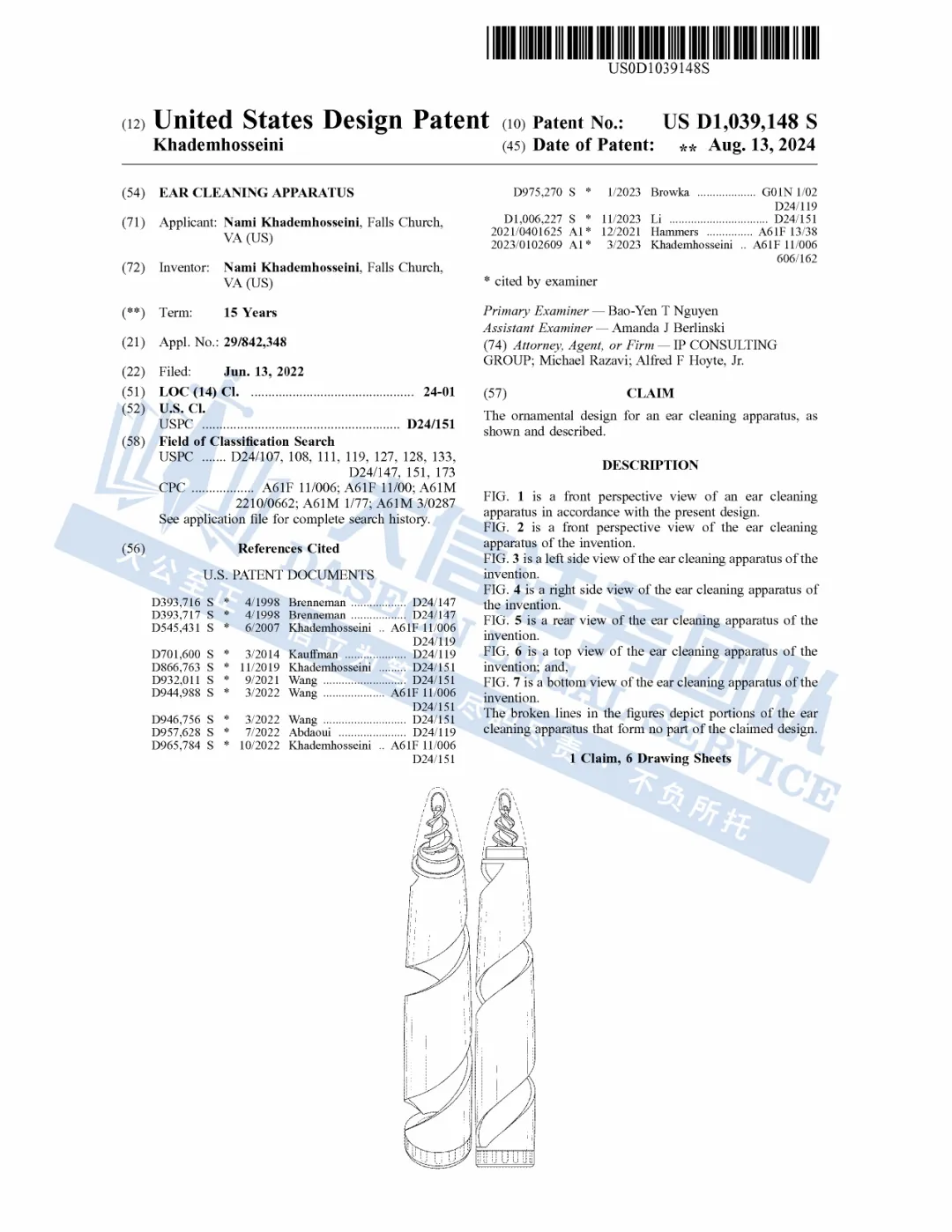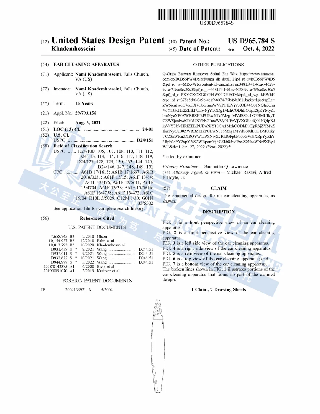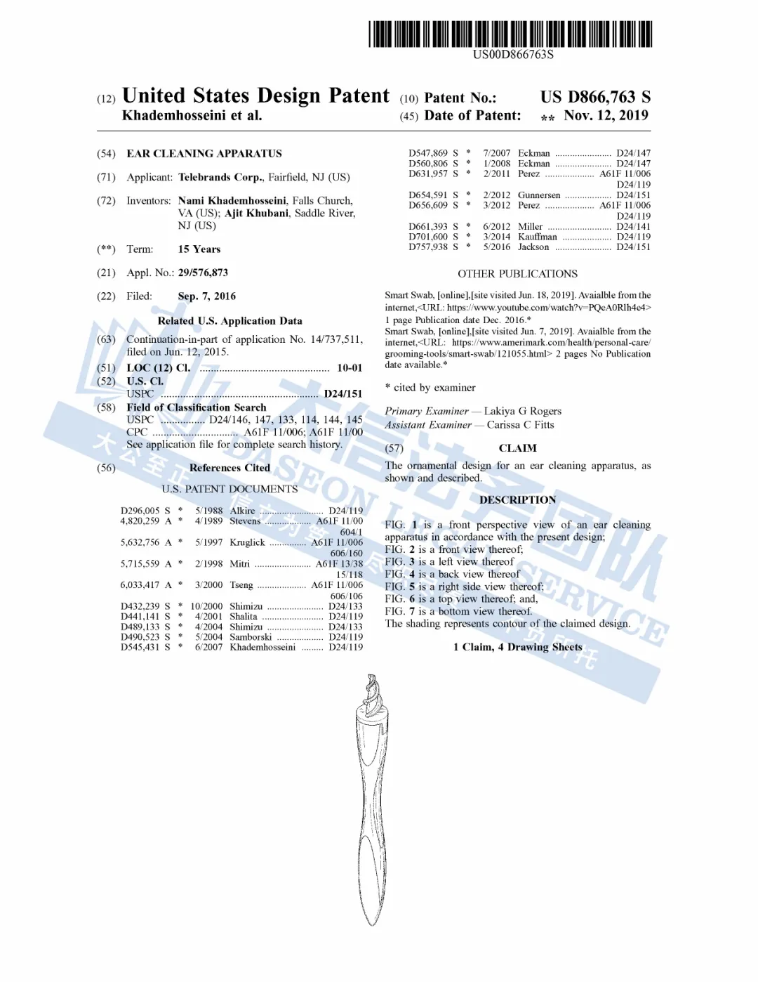 此案为商标+专利维权,目前有45家店铺被波及,涉及2个商标+3个外观专利,商标词:Smart Swab、Ear-O-Care,外观专利号:US D1,039,148 S、 US D965,784 S、US D866,763 S,以下是涉及商标+专利的具体信息,未经授权不得擅自使用,侵权风险极高,跨境卖家尽快检索下架,避免TRO侵权风险!