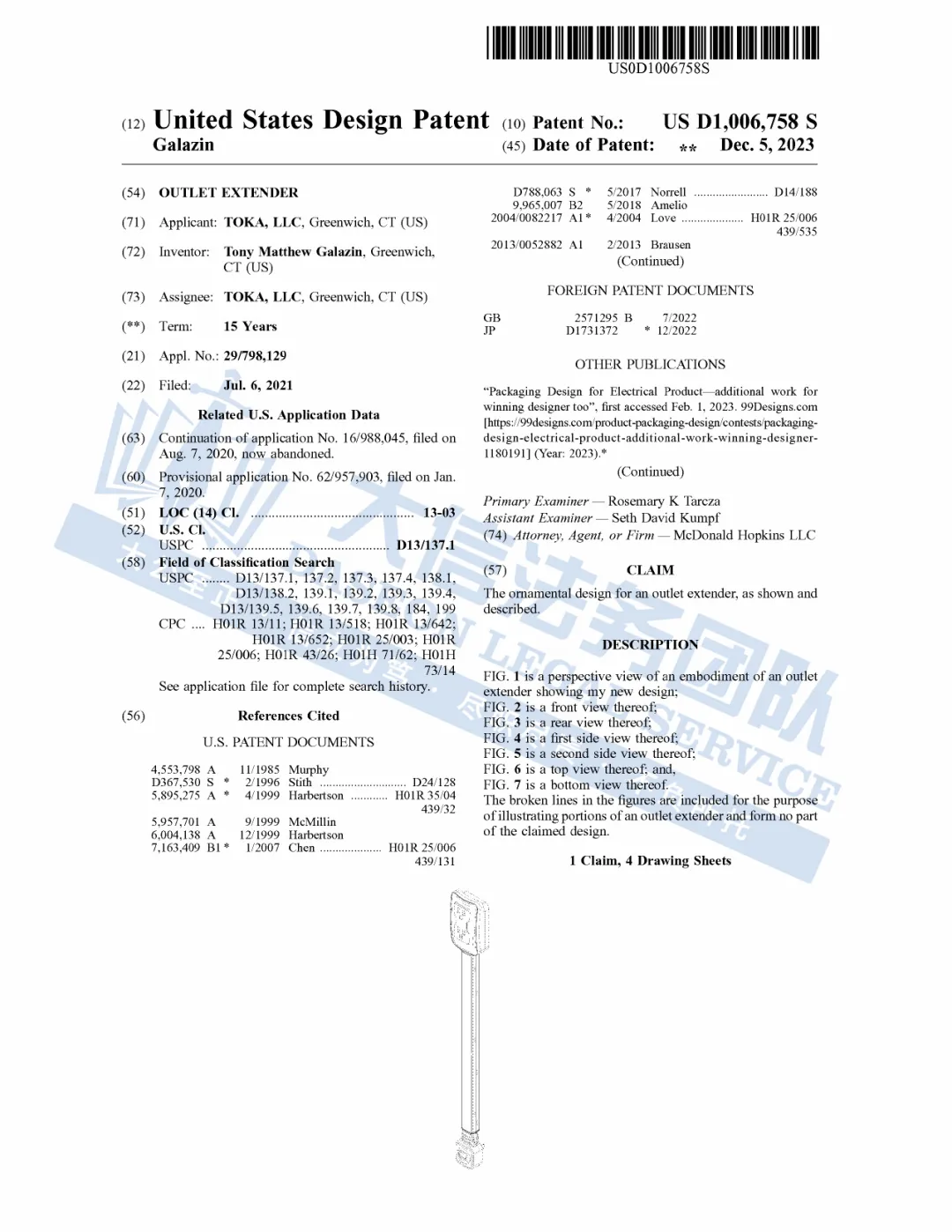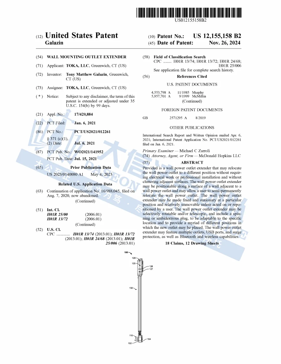 此案为专利维权,涉及2项专利,一项外观专利:US D1,006,758 S,一项发明专利:US 12,155,158 B2,以下是涉及专利的具体信息,未经授权不得擅自使用,侵权风险极高,跨境卖家尽快检索下架,避免TRO侵权风险!