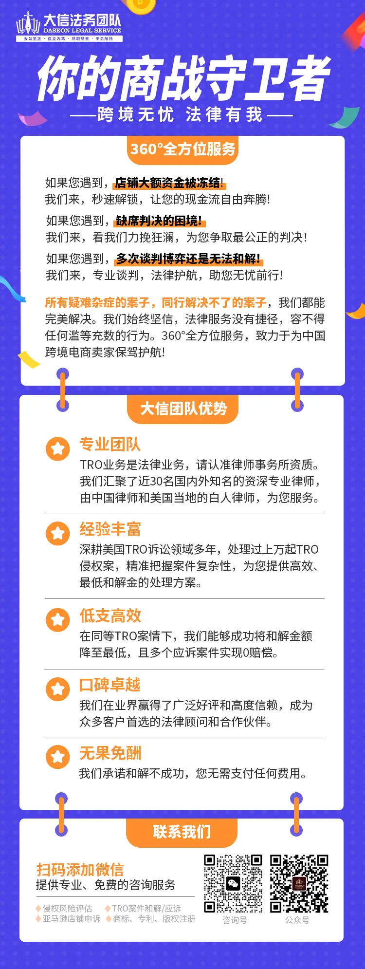 我们始终坚信,法律服务没有捷径,容不得任何滥竽充数的行为。大信法务团队有中美资深律师,在美国TRO诉讼行业深耕多年,处理过上万起TRO侵权案,致力于为中国跨境电商卖家保驾护航!