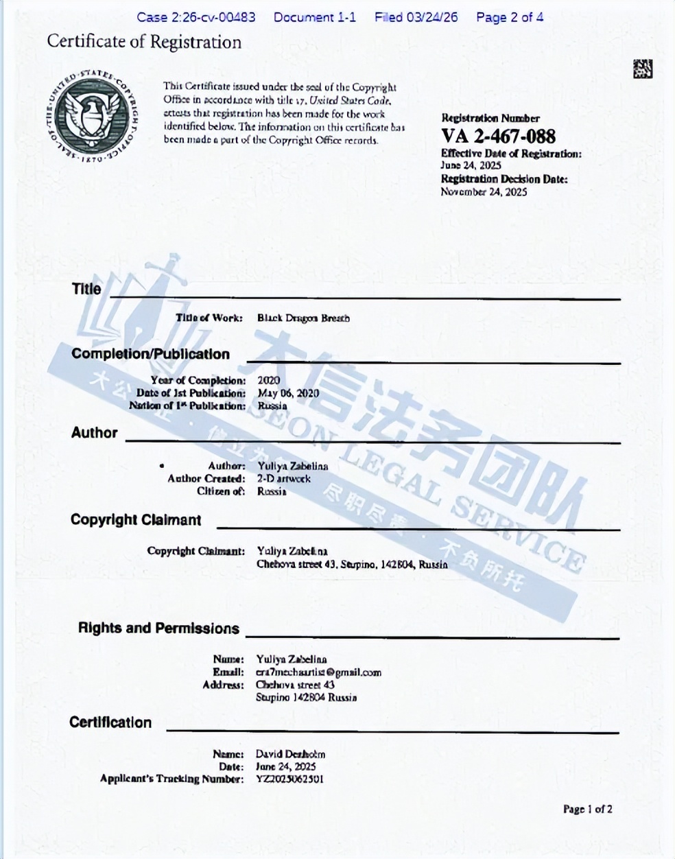 此案为版权维权,涉及1张版权作品,版权号:VA 2-467-088。以下是涉及版权的具体信息,未经授权不得擅自使用,侵权风险极高,跨境卖家尽快检索下架,避免TRO侵权风险!