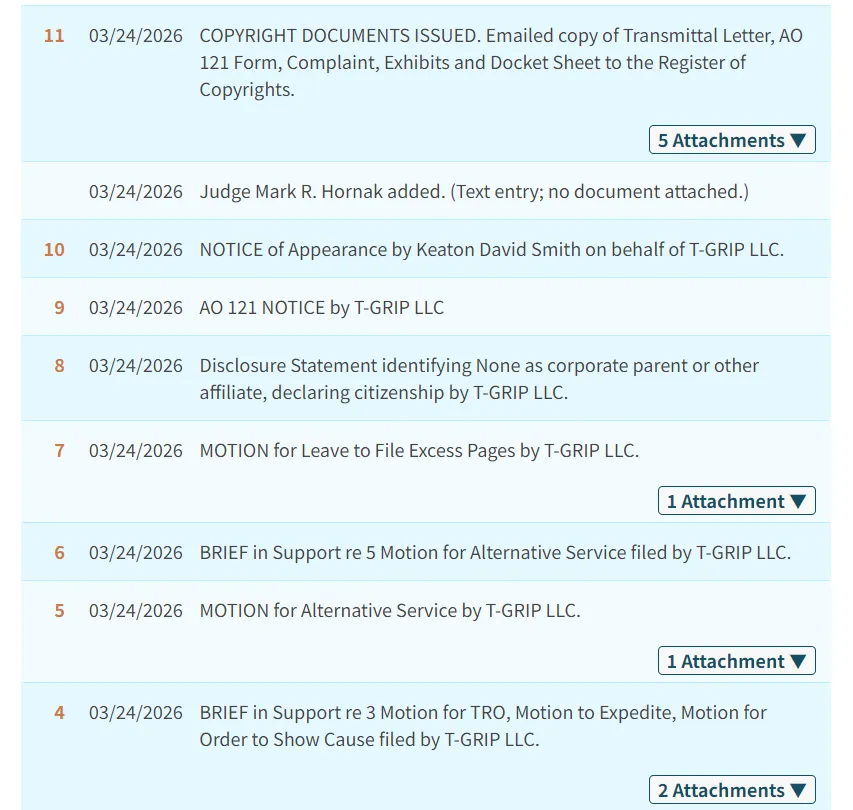 此案为商标和版权维权,涉及T-Grip商标和三个版权,版权号:PAu4-278-759、PAu4-278-762及PAu4-278-761。以下是涉及版权的具体信息,未经授权不得擅自使用,侵权风险极高,跨境卖家尽快检索下架,避免TRO侵权风险!