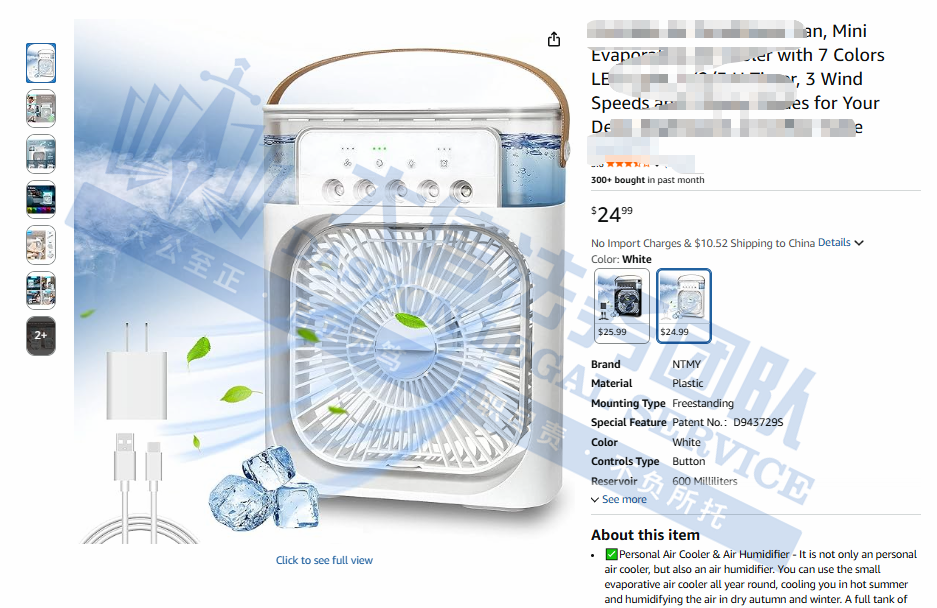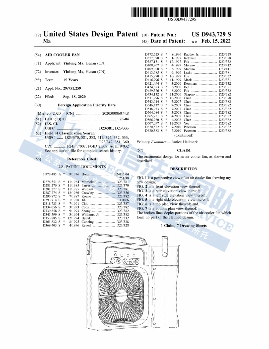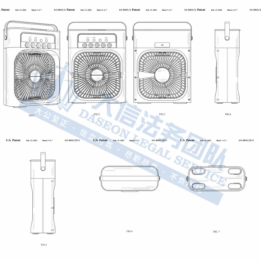此案为专利维权,涉及一项便携式冰风扇冷风机,专利号:D943729,于2020年9月18日,并于2022年2月15日下证,注意该专利为外观专利,只要外观相似就会有侵权的风险,以下是涉及专利的具体信息,未经授权不得擅自使用,侵权风险极高,跨境卖家尽快检索下架,避免TRO侵权风险!