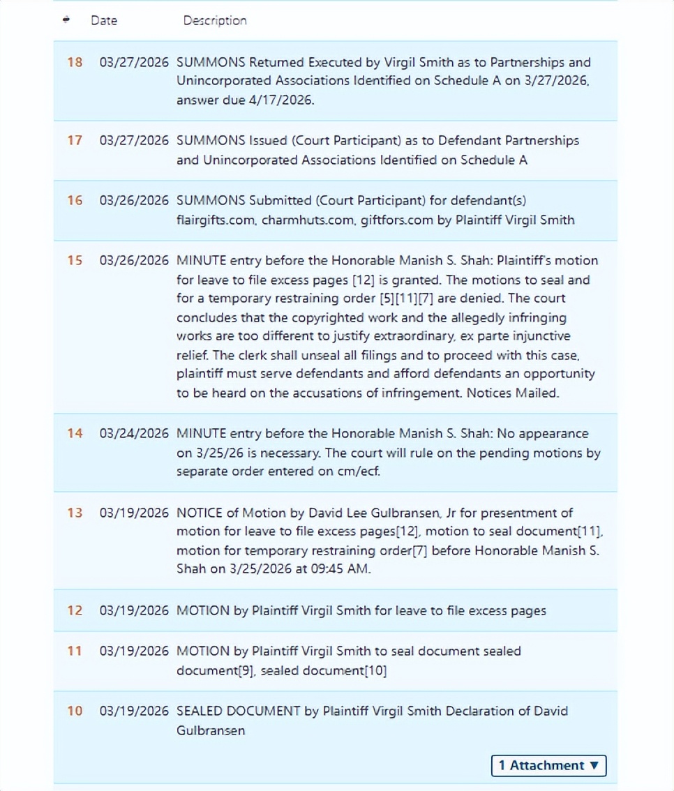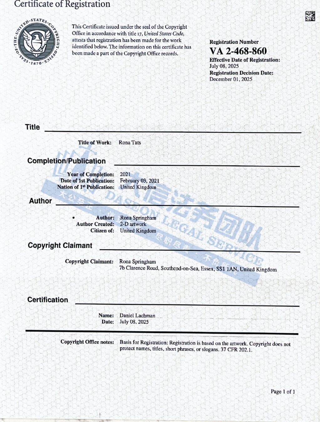 此案为版权维权,涉及一张版权图,版权号:VA 2-468-860,于2025年7月8日下证,除此之外,官网上的图片均不可擅自使用,以下是涉及版权的具体信息,未经授权不得擅自使用,侵权风险极高,跨境卖家尽快检索下架,避免TRO侵权风险!