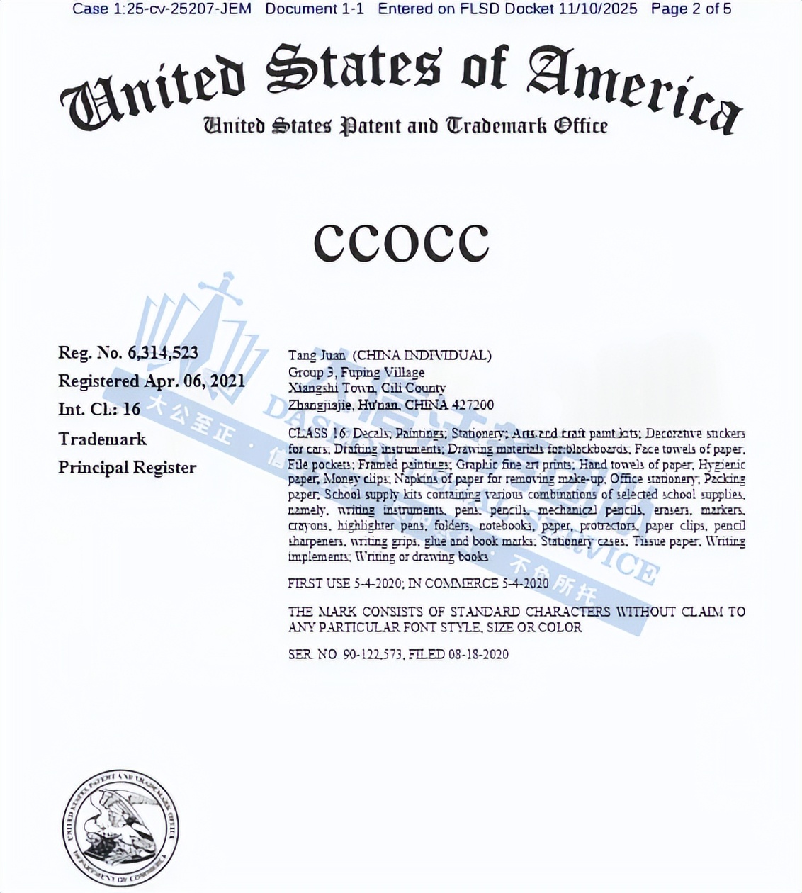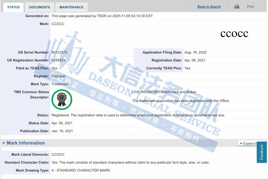 此案为商标维权,共涉及一个商标“ccocc”,商标号:6314532。以下是涉及商标的具体信息,未经授权不得擅自使用,侵权风险极高,跨境卖家尽快检索下架,避免TRO侵权风险!