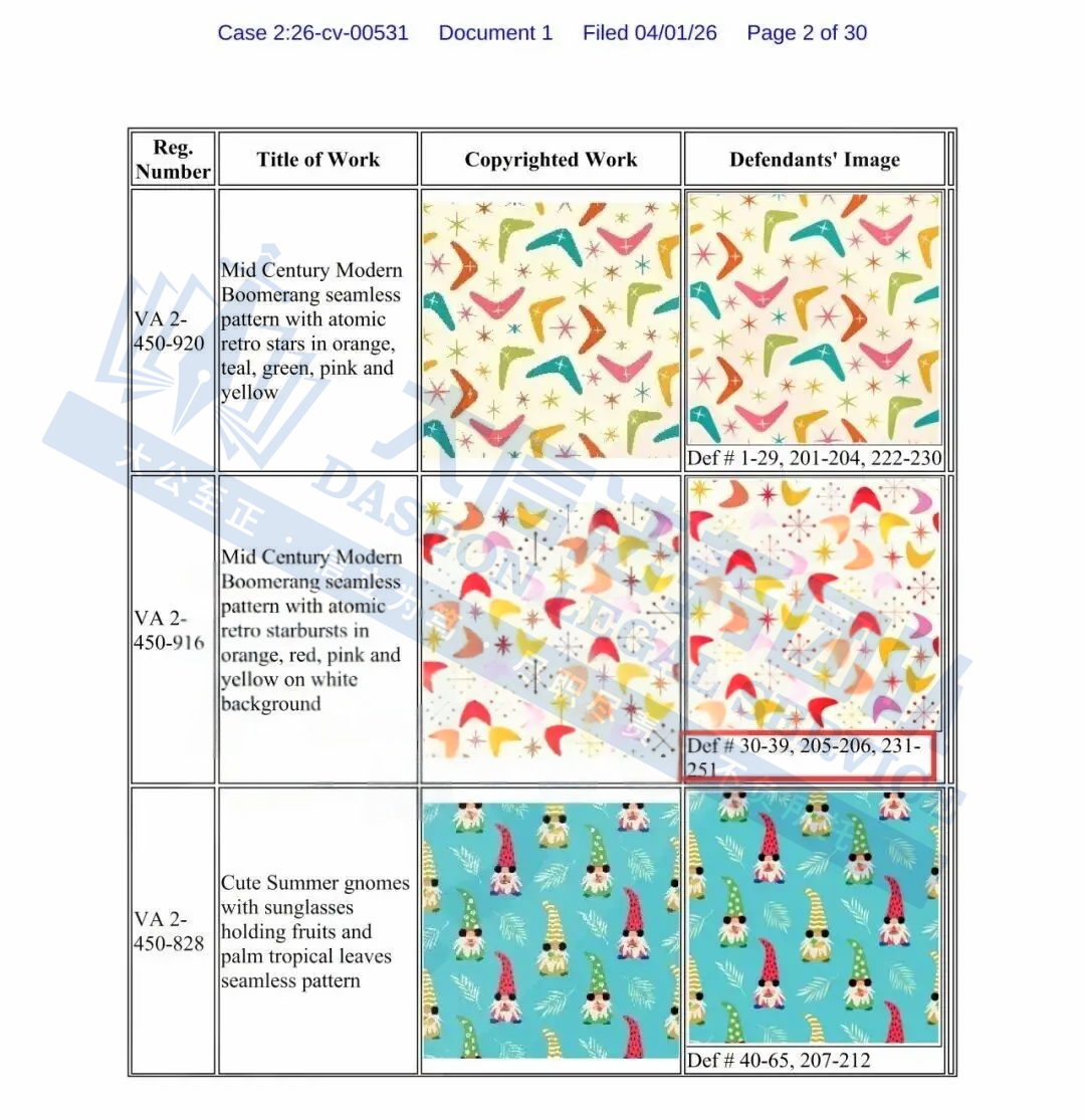 本案为版权侵权,涉及原告旗下24张版权图,版权号:VA2450920、VA2450916等。以下是涉及版权的具体信息,未经授权不得擅自使用,侵权风险极高,跨境卖家尽快检索下架,避免TRO侵权风险!