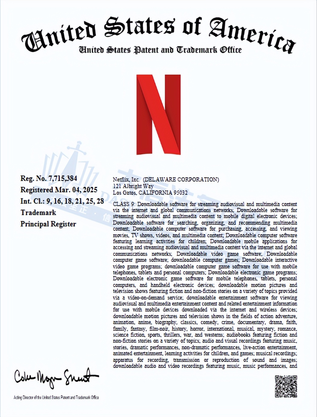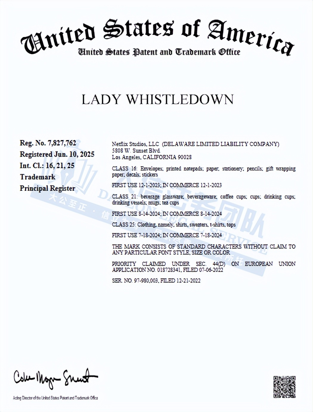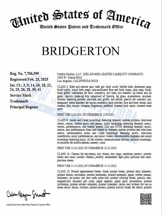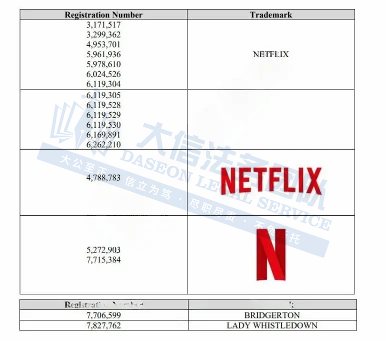 此案为商标维权,涉及Netflix、N、以及BRIDGERTON和LADY WHISTLEDOWN等多个文字和图形商标,以下是涉及商标的具体信息,未经授权不得擅自使用,侵权风险极高,跨境卖家尽快检索下架,避免TRO侵权风险!
