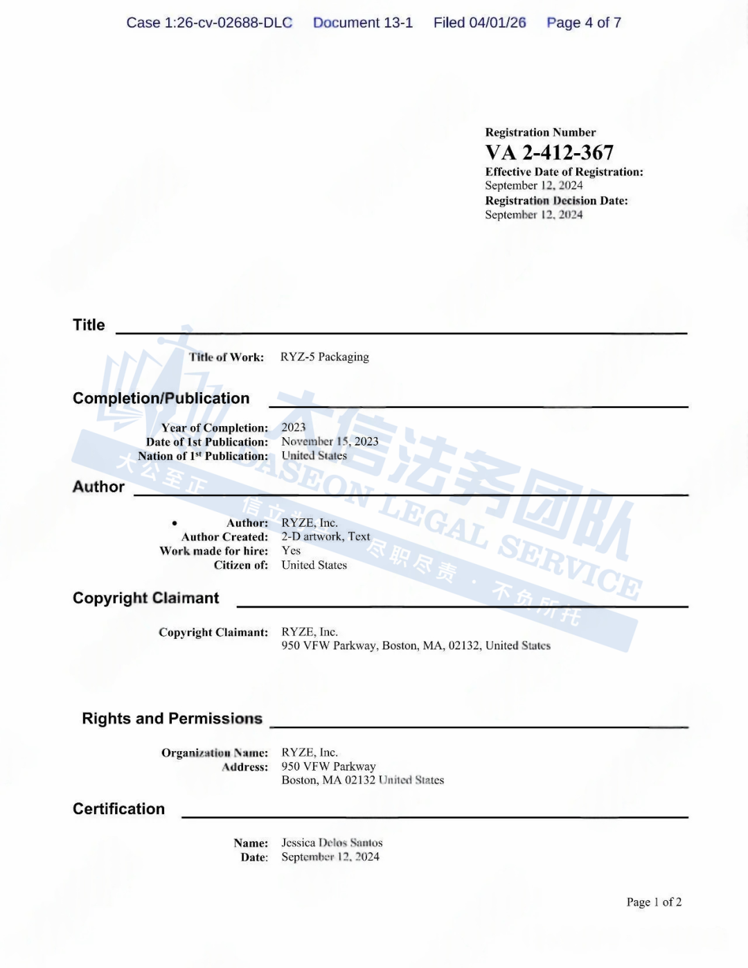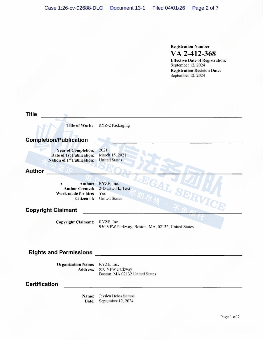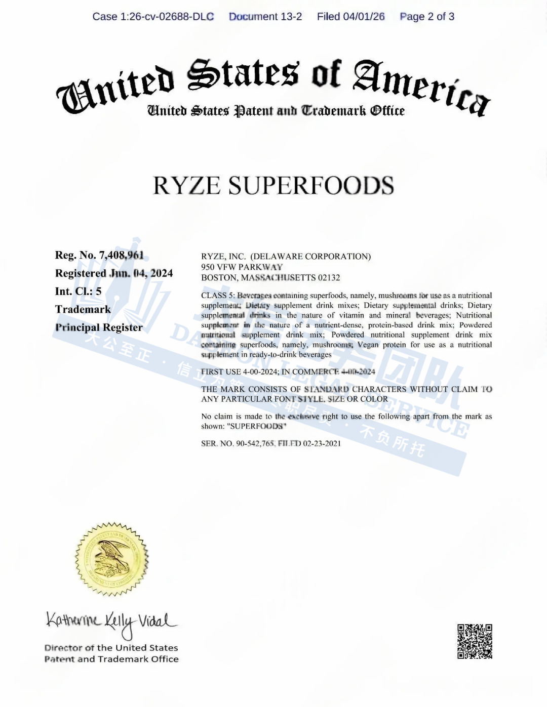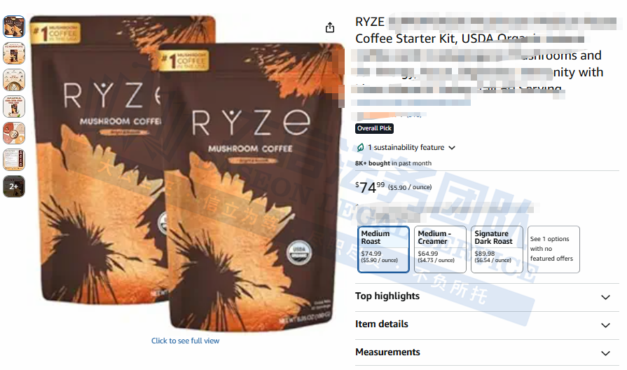 此案为商标+版权维权,涉及1个商标RYZE SUPERFOODS、3张版权图片;以下是涉及商标+版权的具体信息,未经授权不得擅自使用,侵权风险极高,跨境卖家尽快检索下架,避免TRO侵权风险!