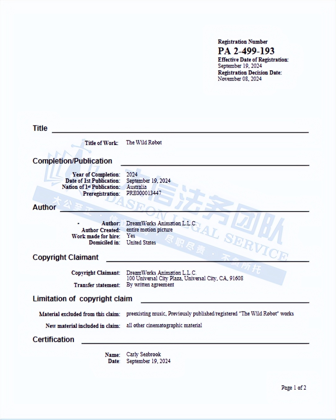 原告是美国知名娱乐公司,专注于电影、动画、电视节目制作与发行等领域。he Wild Robot是DreamWorks于2024年上映的动画电影,该片改编自彼得·布朗同名畅销小说,讲述了机器人萝斯因意外漂流至荒岛,在适应自然环境的过程中与岛上动物建立深厚友谊,并成为孤儿小雁的妈妈,逐渐找到归属感的故事。